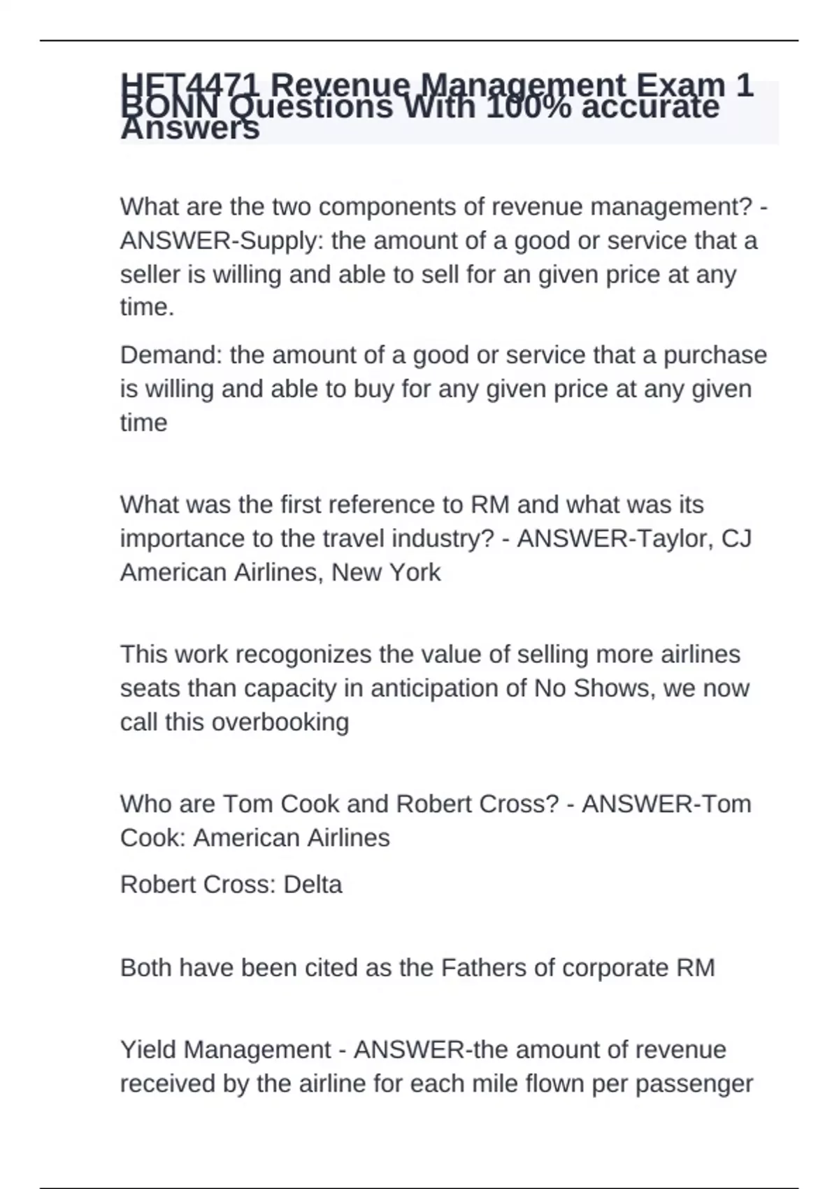 What are the two components of revenue management? - ANSWER-Supply: the amount of a good or service that a seller is willing and able to sell for an given price at any time. Demand: the amount of a good or service that a purchase is willing and able to buy for any given price at any given time What was the first reference to RM and what was its importance to the travel industry? - ANSWER-Taylor, CJ American Airlines, New York This work recogonizes the value of selling more airlines seats than capacity in anticipation of No Shows, we now call this overbooking Who are Tom Cook and Robert Cross? - ANSWER-Tom Cook: American Airlines Robert Cross: Delta Both have been cited as the Fathers of corporate RM