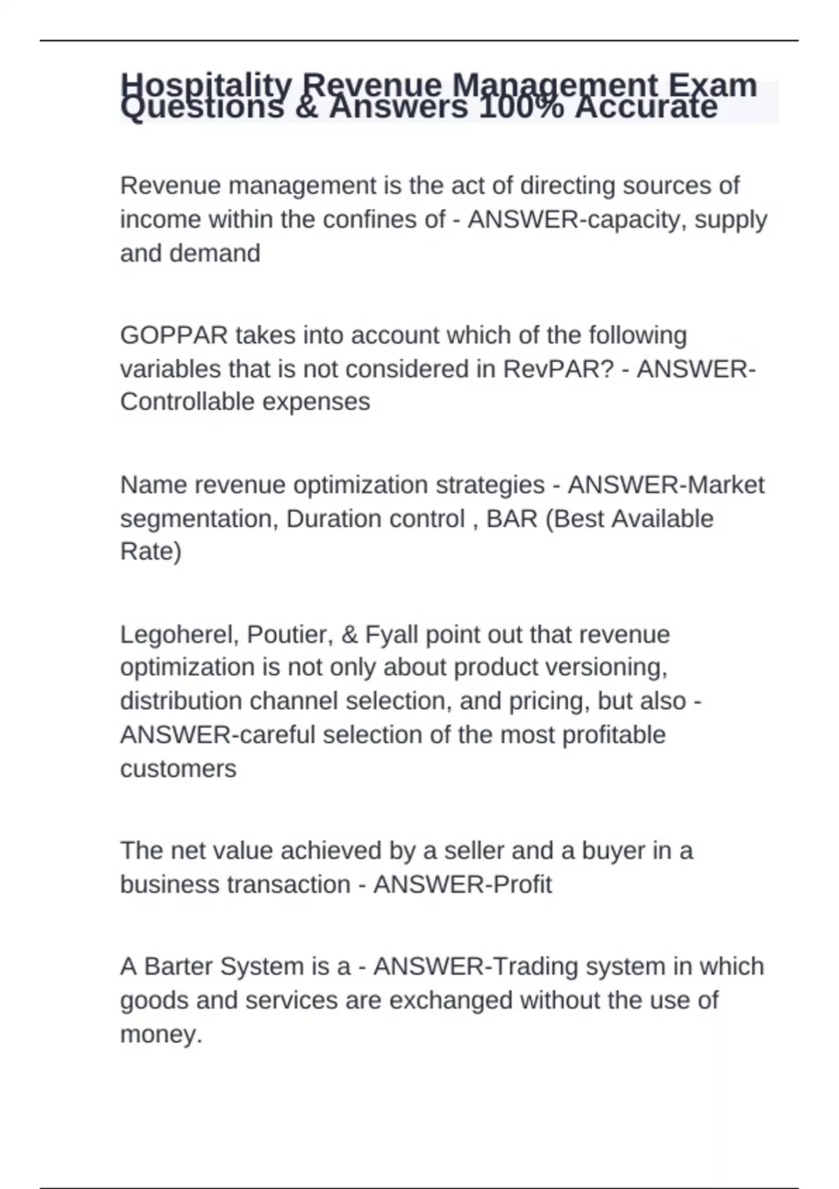 Revenue management is the act of directing sources of income within the confines of - ANSWER-capacity, supply and demand GOPPAR takes into account which of the following variables that is not considered in RevPAR? - ANSWER-Controllable expenses Name revenue optimization strategies - ANSWER-Market segmentation, Duration control , BAR (Best Available Rate) Legoherel, Poutier, & Fyall point out that revenue optimization is not only about product versioning, distribution channel selection, and pricing, but also - ANSWER-careful selection of the most profitable customers The net value achieved by a seller and a buyer in a business transaction - ANSWER-Profit A Barter System is a - ANSWER-Trading system in which goods and services are exchanged without the use of money.