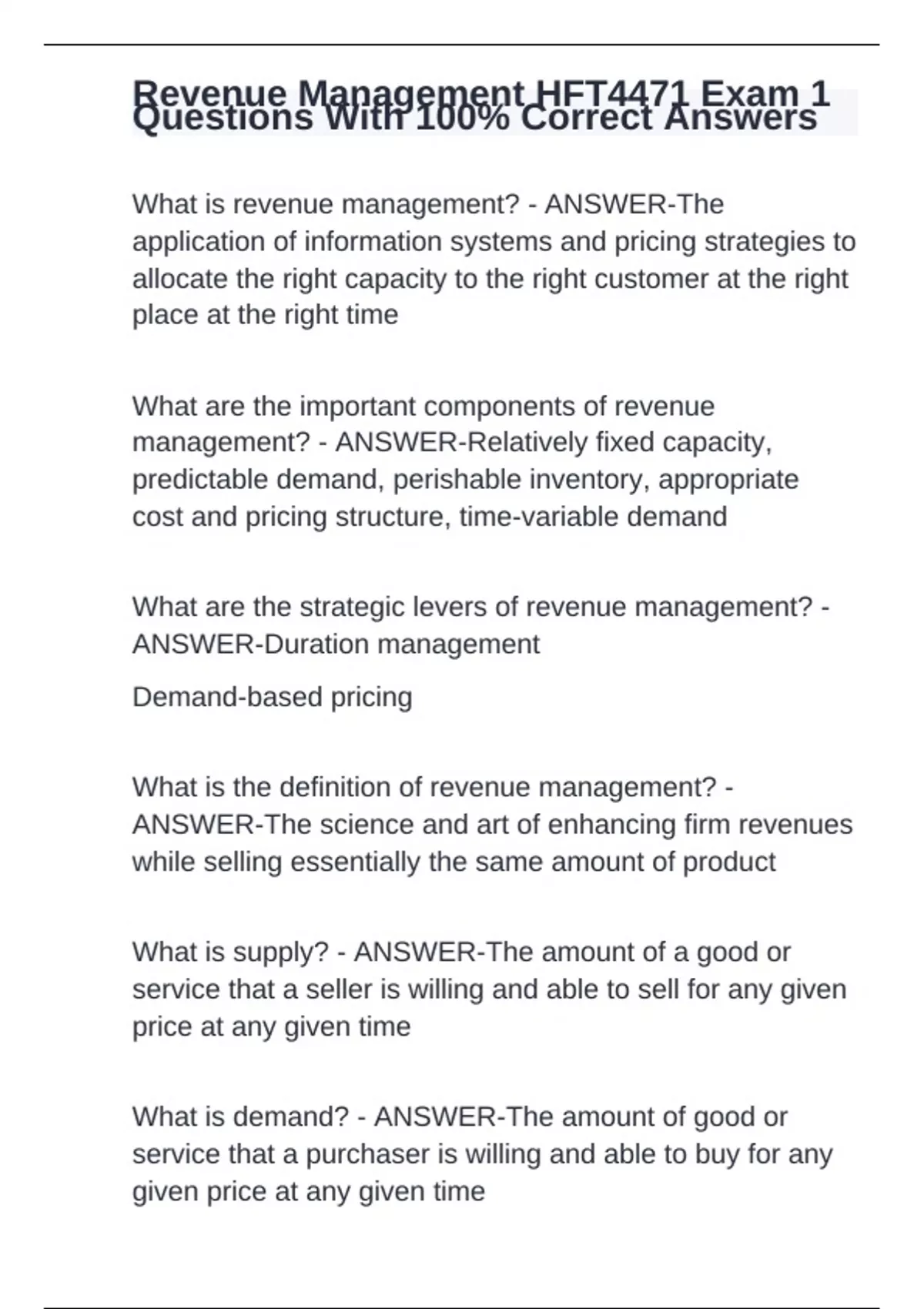What is revenue management? - ANSWER-The application of information systems and pricing strategies to allocate the right capacity to the right customer at the right place at the right time What are the important components of revenue management? - ANSWER-Relatively fixed capacity, predictable demand, perishable inventory, appropriate cost and pricing structure, time-variable demand What are the strategic levers of revenue management? - ANSWER-Duration management Demand-based pricing What is the definition of revenue management? - ANSWER-The science and art of enhancing firm revenues while selling essentially the same amount of product What is supply? - ANSWER-The amount of a good or service that a seller is willing and able to sell for any given price at any given time