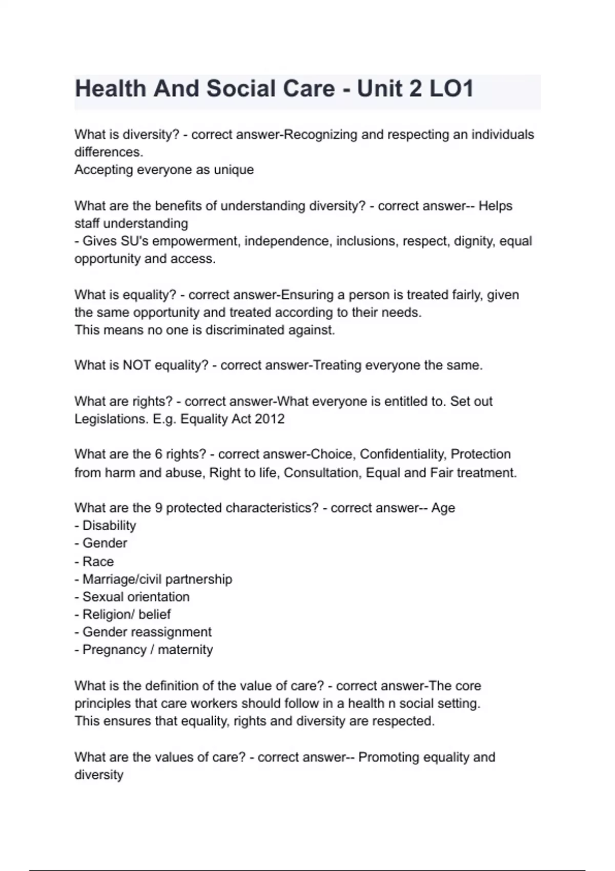 Health And Social Care - Unit 2 LO1 Questions with 100% Actual correct answers | verified | latest update | Graded A+ | Already Passed | Complete Solution