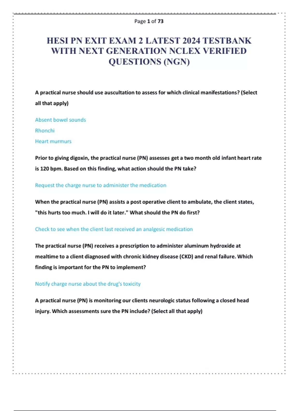 Page 1 of 73 HESI PN EX IT EXAM 2 LATEST 2024 TESTBANK WITH NEXT GENERATION NCLEX VERIFIED QUESTIONS (NGN) A practical nurse should use auscultation to assess for which clinical manifestations? (Select all that apply) Absent bowel sounds Rhonchi Heart murmurs Prior to giving digoxin, the practical nurse (PN) assesses get a two month old infant heart rate is 120 bpm. Based on this finding, what action should the PN take? Request the charge nurse to administer the medication When the practical nurse (PN) assists a post operative client to ambulate, the client states, "this hurts too much. I will do it later." What should the PN do first? Check to see when the client last received an analgesic medication The practical nurse (PN) receives a prescription to administer aluminum hydroxide at mealtime to a client diagnosed with chronic kidney disease (CKD) and renal failure. Which finding is important for the PN to implement? Notify charge nurse about the drug's toxicity A practical nurse (PN) is monitoring our clients neurologic status following a closed head injury. Which assessments sure the PN include? (Select all that apply) Page 2 of 73 Consciousness level Vital sign measurement Pupillary reaction The practical nurse (PN) is mobi lizing a client with left hemiplegia after a cerebrovascular accident. The client demonstrates stability in weight bearing and transferring. While assisting the client with a pivot transfer out of the bed, at what location should a wheelchair be positioned ? Head of the bed, facing the foot, on the right side of the bed The practical nurse (PN) is caring for a child in a 90 -90 skeletal traction. Where should the PN monitor the child for signs of compartment syndrome? Select the correct location on the image. To change, click on a new location. Toes When the practical nurse (PN) attempts to assist an 18 year old client with a mild mental disability to ambulate on the first postoperative day after an appendectomy, she becomes angry and yells at the PN, "Get out of here. I'll get up when I'm ready!" Which response is best for the PN to make? I will be back in 30 minutes to help you get out of bed and walk around the room today The practical nurse (PN) is preparing to administer a client prescribed 0900 dose of on e tablet of bisacodyl when the client states that he has recently expelled three large, semi -formed bowel movements. Which action should the practical nurse (PN) take? Alert the charge nurse about the diarrhea and hold the scheduled dose of bisacodyl until new orders are received from healthcare provider. Page 3 of 73 I highly successful businessman presents to the community mental health center complaining of sleeplessness and anxiety over his financial status. Which action should the practical nurse (PN) take to assis t this client in diminishing his anxiety? Teach him to limit sugar and caffeine intake A client who is in Gravida 01, para 0, is transferred to the recovery room following a normal vaginal delivery of a healthy newborn. The practical nurse (PN) observes th e client is shaking uncontrollably and states she is cold. Which intervention should the PN perform? Apply light, warmed blankets and assure her that this is normal following delivery An adult with a history of cardiovascular disease comes to the clinic co mplaining of indigestion. Vital signs are heart rate 130 bpm, respirations 24 breaths per minute and blood pressure 180/90. Which finding show the practical nurse (PN) report immediately to the healthcare provider. Left jaw discomfort A male client attends a community support program for mentally impaired and chemical abusing clients. The client tells the practical nurse (PN) that his drugs of choice or cocaine and heroin. What is the greatest risk for this client? Hepatitis Four hours after administration of regular insulin 20 units subcutaneous (SUBQ), a client becomes shaky and diaphoretic. Which action should the practical nurse take? Give client crackers and milk During immediate postoperative period, which condition has the highest priority when planni ng Nursing care? respiratory obstruction Page 4 of 73 A mother brings her five children to the clinic for school physical examinations. Which assessment findings should alert the practical nurse that intergenerational violence may be occurring in the home? Select all t hat apply. The six -year -old son hits his younger sister during the interview The 10 -year -old daughter has circular burns on her trunk and legs The three year old has multiple bruises on the chest and both legs During a clinic visit, the practical nurse (PN ) observed that an infant is sucking on a pacifier that is made from a bottle nipple with stuffed cotton. What should the PN do? Encourage the mother to use a one piece pacifier An older adult female is admitted with syncope and laboratory findings indicat e that her hemoglobin is 8.0 g/ DL. She has a recent history of headaches and frequent falls. Admission prescriptions include continuation of all home medications. Which medication should the practical nurse (PN) with hold until consulting with the charge nurse? Aspirin A client with that pseudomonas aeruginosa infection is receiving gentamicin 5 mg IM every 12 hours. The pharmacy provides a vial labeled gentamicin sulfate 80 mg/2ML. How many ML's should the practical nurse (PN) administer? Enter numeric value only. If ro unding is required round to the nearest hundredth. 5mg/1 x 2ml/80mg= 0.125 or .13mL In obtaining a series of stool specimens for occult blood, which instructions should the practical nurse (PN) provide to the client? Defecate into the container separately from urinating in the toilet. The practical nurse (PN) is caring for a client with a new prescription for fluticasone furoate nasal spray, a glucocorticoid prescribed for the clients nasal allergy symptoms. In reinforcing