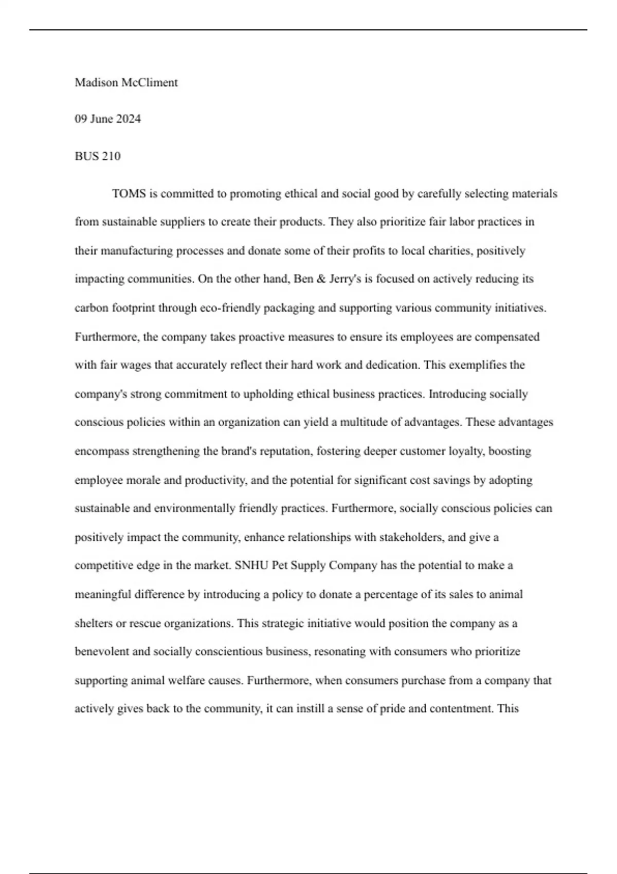 Imagine that you have been hired as a consultant to investigate the social responsibility of two companies, TOMS Shoes and Ben & Jerry's. Your manager finds both of these companies to be inspirational. She would like the SNHU Pet Supply Company to become more socially conscious and has asked you to investigate what Toms and Ben & Jerry's are doing. You are responsible for researching how their socially responsible practices impact both the companies and their customers. Your manager would like you to make some suggestions about how the SNHU Pet Supply Company can become more socially responsible and make ethical decisions.