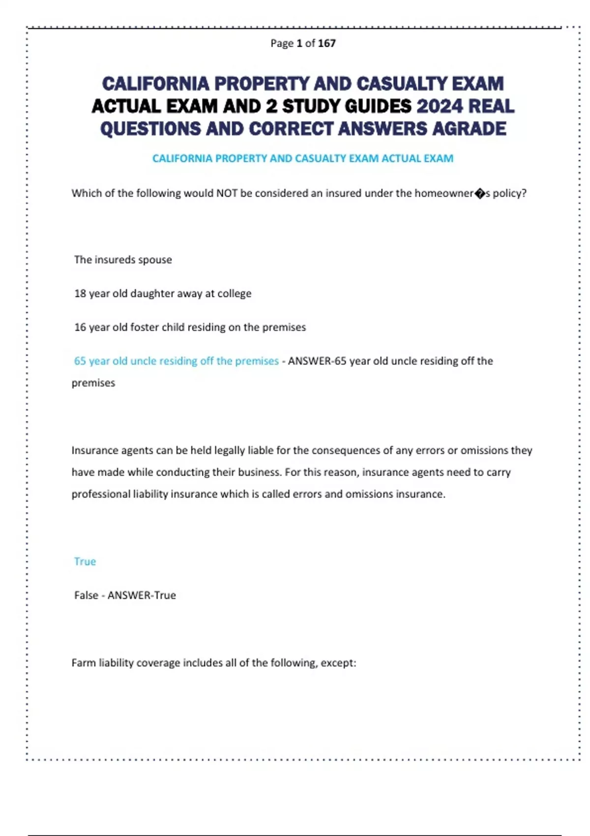 CALIFORNIA PROPERTY AND CASUALTY EXAM ACTUAL EXAM AND 2 STUDY GUIDES 2024 REAL QUESTIONS AND CORRECT ANSWERS AGRADE