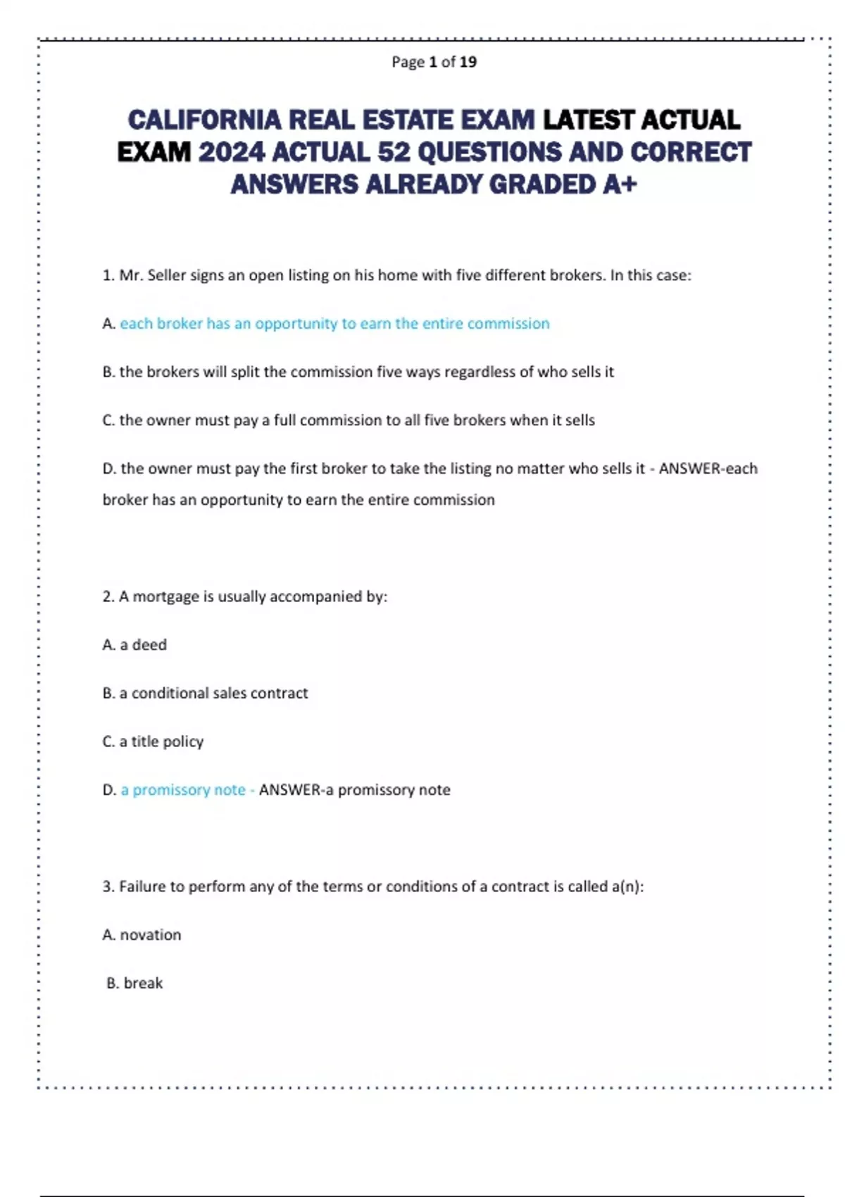 CALIFORNIA REAL ESTATE EXAM LATEST ACTUAL EXAM 2024 ACTUAL 52 QUESTIONS AND CORRECT ANSWERS ALREADY GRADED A+