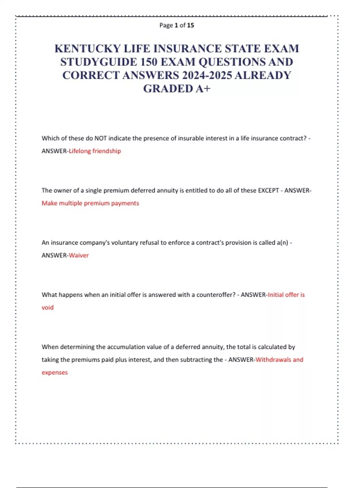 KENTUCKY LIFE INSURANCE STATE EXAM STUDYGUIDE 150 EXAM QUESTIONS AND CORRECT ANSWERS ALREADY GRADED A+.