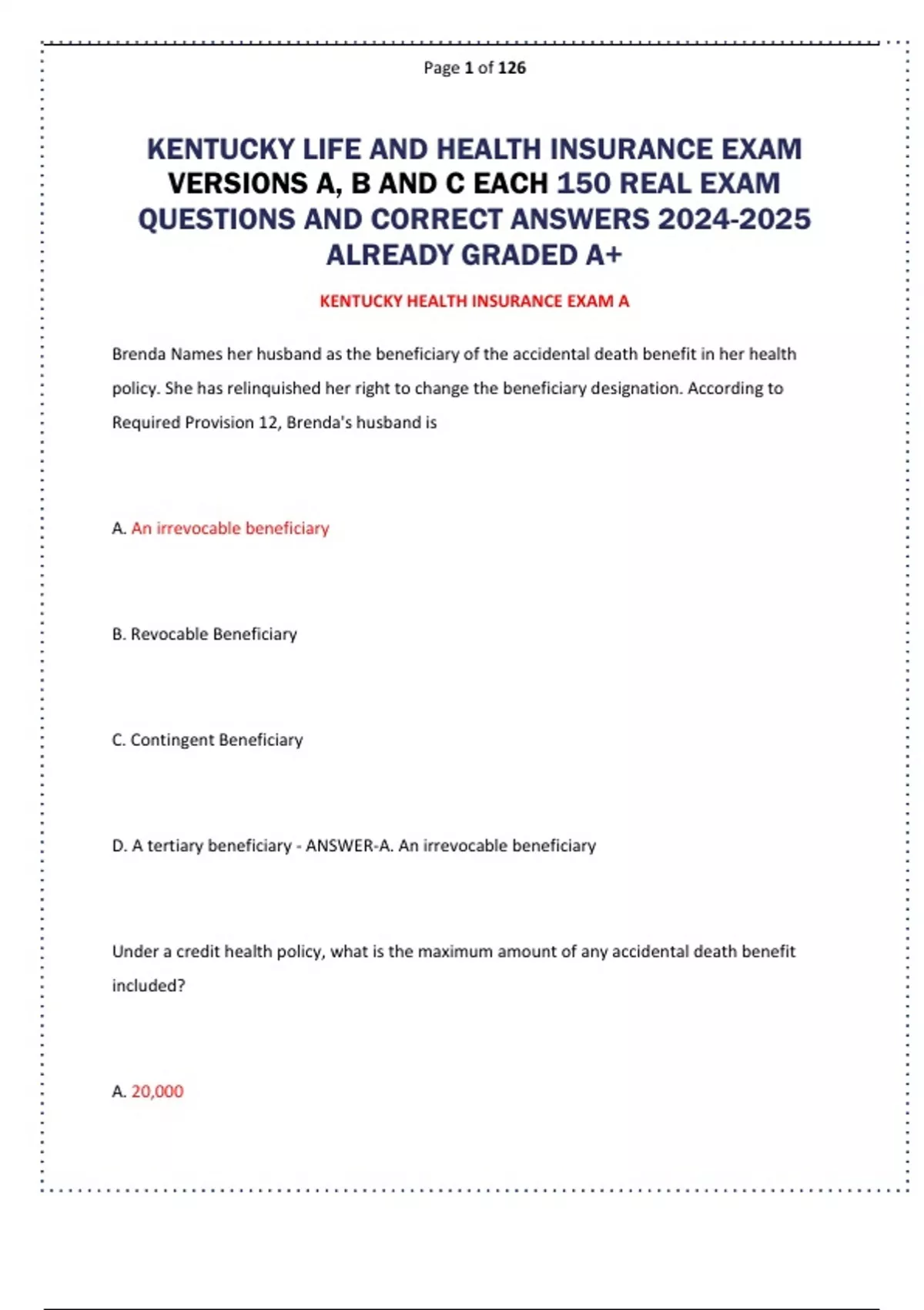 KENTUCKY LIFE AND HEALTH INSURANCE EXAM VERSIONS A, B AND C EACH 150 REAL EXAM QUESTIONS AND CORRECT ANSWERS ALREADY GRADED A+