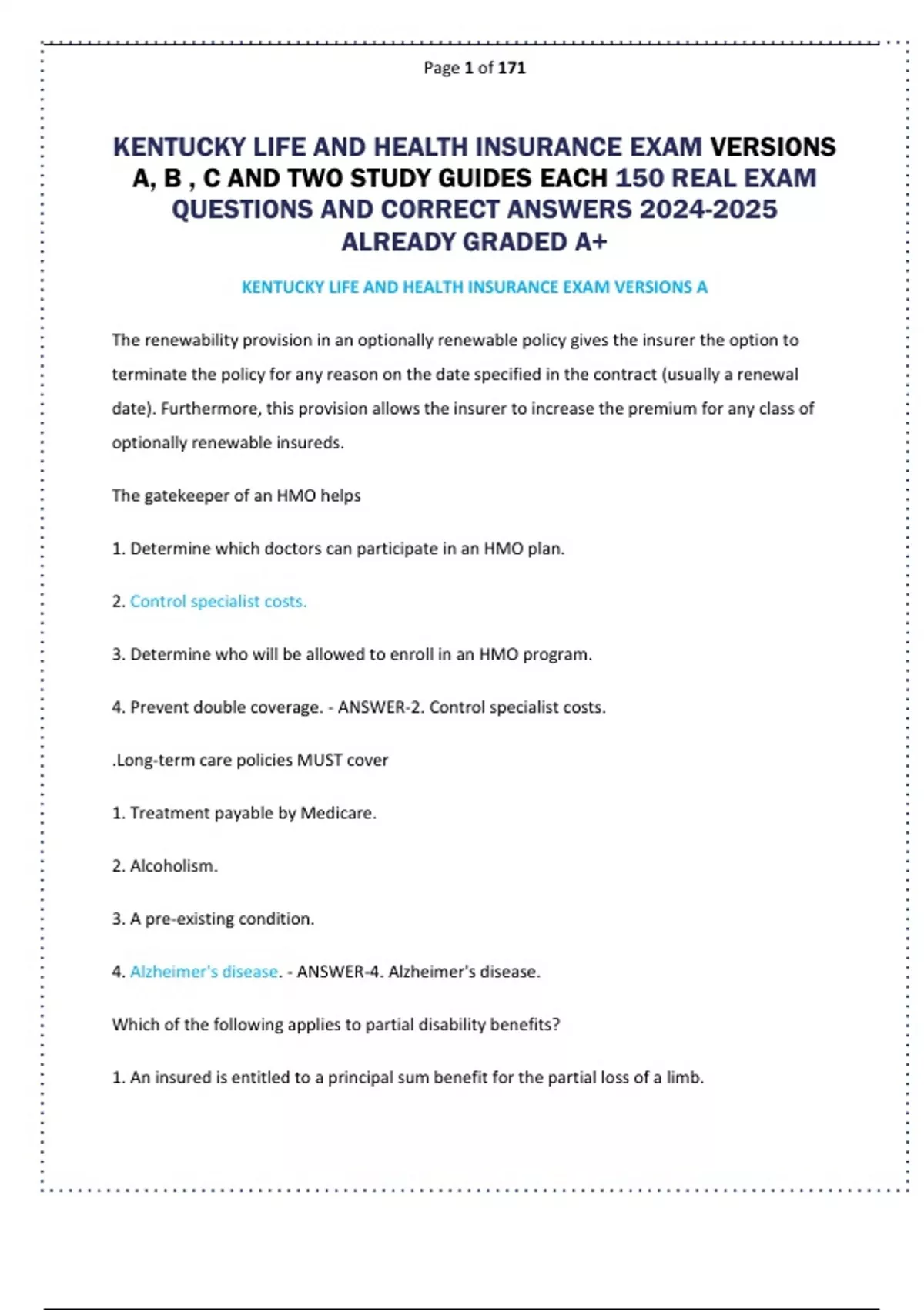 KENTUCKY LIFE AND HEALTH INSURANCE EXAM VERSIONS A, B, C AND TWO STUDY GUIDES EACH 150 REAL EXAM QUESTIONS AND CORRECT ANSWERS ALREADY GRADED A+.p
