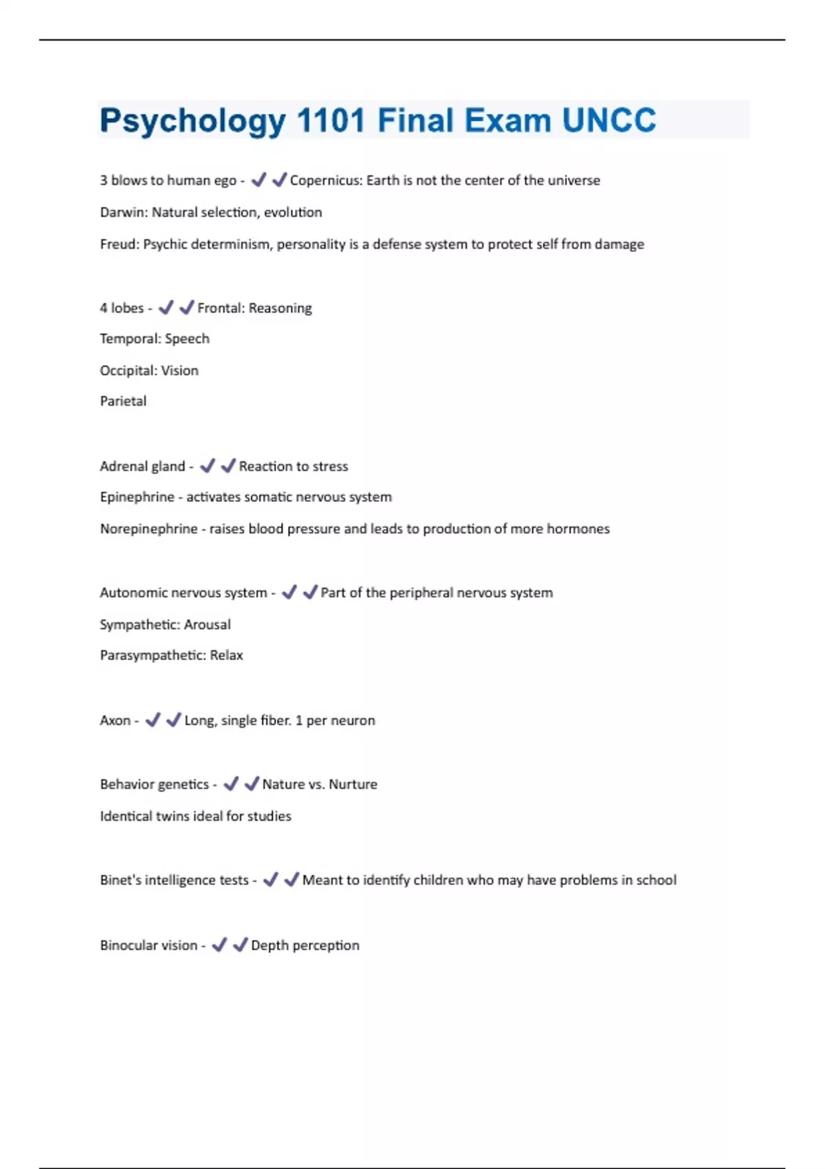 Psychology 1101 Final Exam UNCC (Questions + Answers) Solved