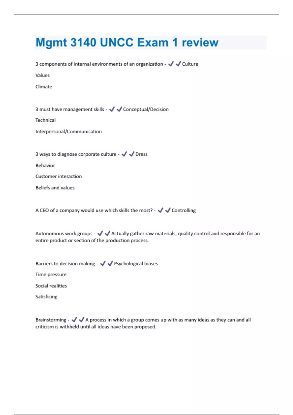 3 components of internal environments of an organization - Culture Values Climate 3 must have management skills - Conceptual/Decision Technical Interpersonal/Communication 3 ways to diagnose corporate culture - Dress Behavior Customer interaction Beliefs and values A CEO of a company would use which skills the most? - Controlling Autonomous work groups - Actually gather raw materials, quality control and responsible for an entire product or section of the production process. Barriers to decision making - Psychological biases Time pressure Social realities Satisficing Brainstorming - A process in which a group comes up with as many ideas as they can and all criticism is withheld until all ideas have been proposed.Characteristics of managerial decision making - Risk:When the probability of an action being successful is less than 100 percent and losses may occur. Uncertainty: The manager has insufficient information to know the consequences of different actions. Conflict: When a manager must consider opposing pressures from different sources, occurs at two levels. Lack of Structure: Programmed and Non-Programmed Decisions. The usual state of affairs in managerial decision making. Although some decisions are routine and clear-cut, for most there is no automatic procedure to follow. Competing value models of culture - Clan: Collaborate, Visionary Leadership, Strong Loyalty and Tradition, High Commitment, "How Things are Done Here" Adhocracy: Create, Innovative Leadership, Entrepreneurial, Possibilities and risk, "Product Leaderhship" Hierarchy: Control, Leaders are efficiency minded, secure employment, "not fully understood" Market: Compete, Leaders are result oriented, competitive, competitive advantage Contributions/benefits of teams - 1. Increase Productivity 2. Improve Quality 3. Reduce Costs 4. Enhance Speed5. Be powerful forces for innovation, creativity and change. Deciding on the first choice or option. - Satisficing