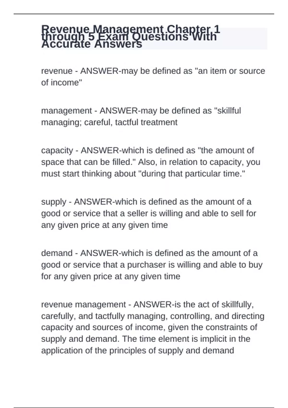 Revenue Management Chapter 1 through 5 Exam Questions With Accurate Answers