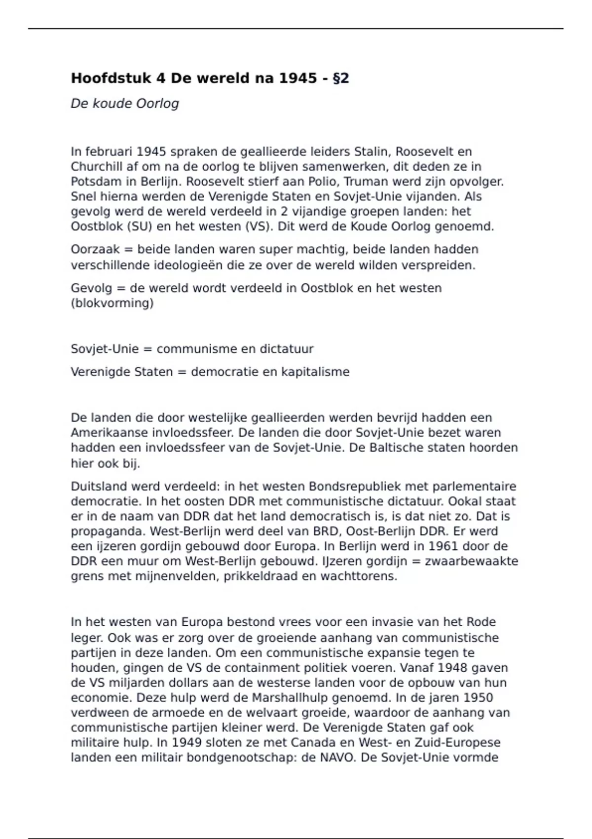 Gevolg = de wereld wordt verdeeld in Oostblok en het westen