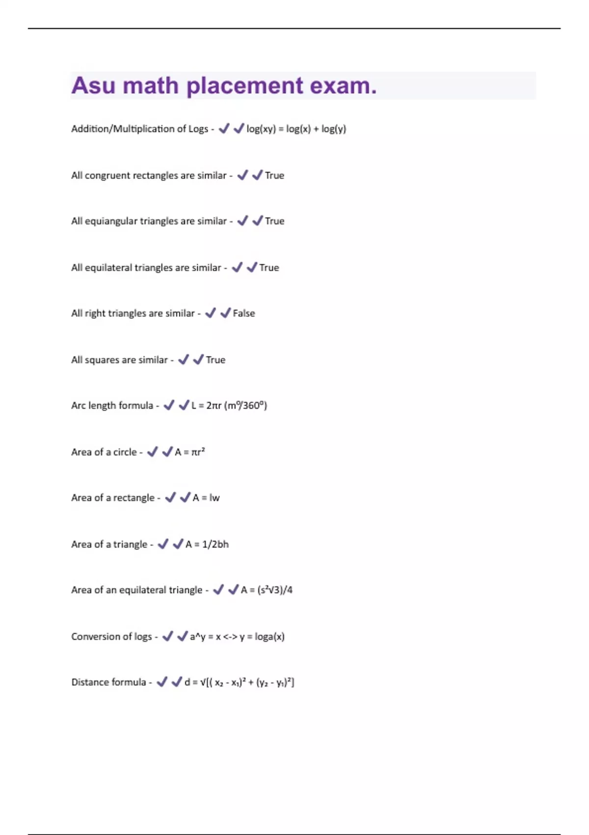 Addition/Multiplication of Logs - log(xy) = log(x) + log(y) All congruent rectangles are similar - True All equiangular triangles are similar - True All equilateral triangles are similar - True All right triangles are similar - False All squares are similar - True Arc length formula - L = 2πr (m⁰/360⁰) Area of a circle - A = πr² Area of a rectangle - A = lw Area of a triangle - A = 1/2bh Area of an equilateral triangle - A = (s²√3)/4 Conversion of logs - a^y = x <-> y = loga(x) Distance formula - d = √[( x₂ - x₁)² + (y₂ - y₁)²]