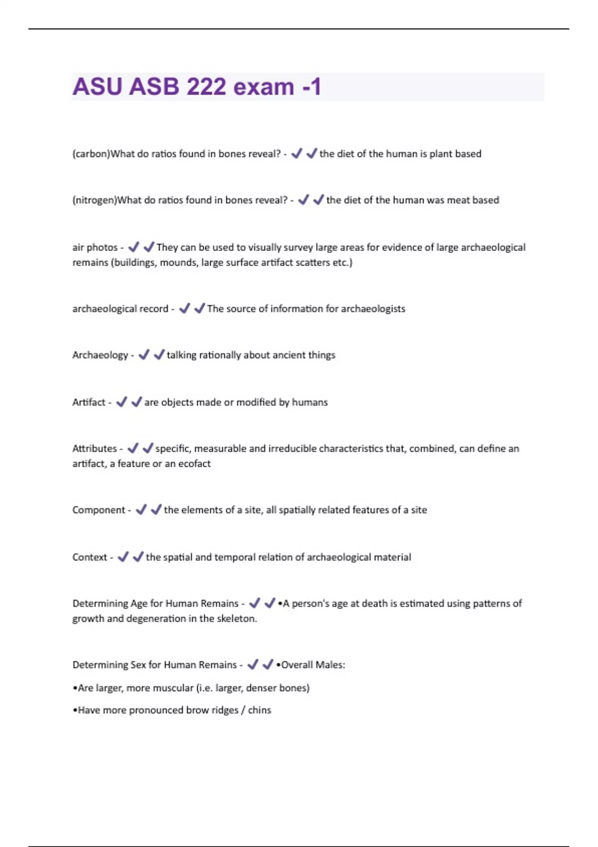 (carbon)What do ratios found in bones reveal? - the diet of the human is plant based (nitrogen)What do ratios found in bones reveal? - the diet of the human was meat based air photos - They can be used to visually survey large areas for evidence of large archaeological remains (buildings, mounds, large surface artifact scatters etc.) archaeological record - The source of information for archaeologists Archaeology - talking rationally about ancient things Artifact - are objects made or modified by humans Attributes - specific, measurable and irreducible characteristics that, combined, can define an artifact, a feature or an ecofact Component - the elements of a site, all spatially related features of a site Context - the spatial and temporal relation of archaeological material Determining Age for Human Remains - •A person's age at death is estimated using patterns of growth and degeneration in the skeleton. Determining Sex for Human Remains - •Overall Males: •Are larger, more muscular (i.e. larger, denser bones) •Have more pronounced brow ridges / chins•Have a narrower pelvis very hard to tell sex of child digging units - •Arbitrary units: the archaeologist picks a unit (e.g. 2x2 m, or 4x4) (e.g. Palaeolithic camp site) • •Architectural units: the observable structures are excavated as a single horizontal provenience (e.g. Palace of King Minos in Crete) Ecofact - are natural materials that have been used by humans
