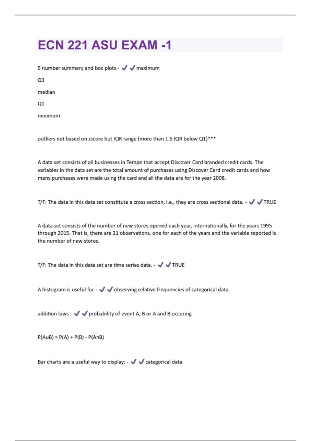 5 number summary and box plots - maximum Q3 median Q1 minimum outliers not based on zscore but IQR range (more than 1.5 IQR below Q1)*** A data set consists of all businesses in Tempe that accept Discover Card branded credit cards. The variables in the data set are the total amount of purchases using Discover Card credit cards and how many purchases were made using the card and all the data are for the year 2008. T/F: The data in this data set constitute a cross section, i.e., they are cross sectional data. - TRUE A data set consists of the number of new stores opened each year, internationally, for the years 1995 through 2015. That is, there are 21 observations, one for each of the years and the variable reported is the number of new stores. T/F: The data in this data set are time series data. - TRUE A histogram is useful for - observing relative frequencies of categorical data. addition laws - probability of event A, B or A and B occuring P(AuB) = P(A) + P(B) - P(AnB) Bar charts are a useful way to display: - categorical datacategorical data (qualitative) - identify characteristics of element ex: gender, marital status ALSO: zip code, phone number classical probability - based on assumption of equally likely outcomes ex: roulette table coefficient of variation - =std dev / mean how large std dev is relative to the mean combination example - 4 openings 11 people qualify 11! / 4! (11-4)! =330 combination EXCEL - =combin(n,k) (# being chosen from, end choices) combinations - n choose k n! / k! (n-k)! complement of event - all sample points NOT IN event A P(A) + P(A)^c = 1 correlation - measure of linear association, not necessarily causationbounds: 1. coefficient can be -1 to +1 2. values near -1 have strong NEGATIVE linear relationship 3. values near 1 have strong POSITIVE linear relationship 4. close to 0 means a WEAKER relationship