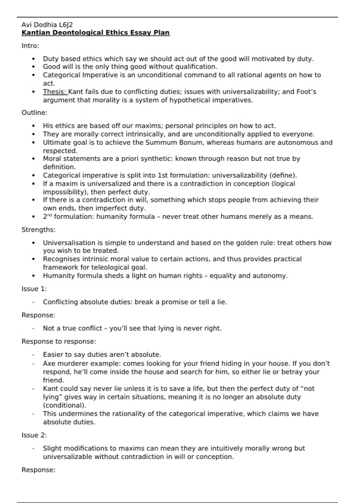 Kantian Deontological Ethics Essay Plan