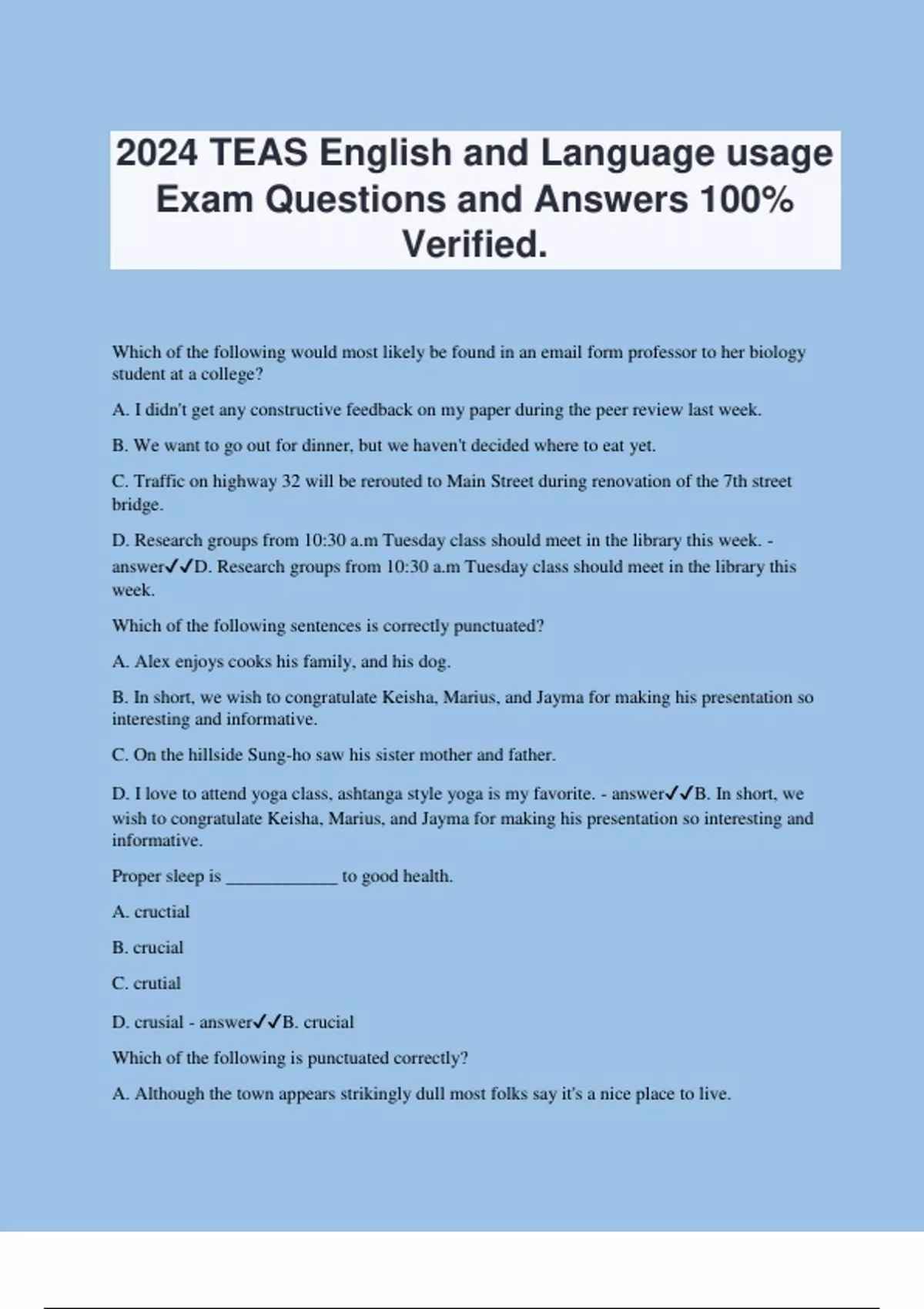 2024 TEAS English and Language usage Exam Questions and Answers 100% Verified. Which of the following would most likely be found in an email form professor to her biology student at a college? A. I didn't get any constructive feedback on my paper during the peer review last week. B. We want to go out for dinner, but we haven't decided where to eat yet. C. Traffic on highway 32 will be rerouted to Main Street during renovation of the 7th street bridge. D. Research groups from 10:30 a.m Tuesday class should meet in the library this week. - answerD. Research groups from 10:30 a.m Tuesday class should meet in the library this week. Which of the following sentences is correctly punctuated? A. Alex enjoys cooks his family, and his dog. B. In short, we wish to congratulate Keisha, Marius, and Jayma for making his presentation so interesting and informative. C. On the hillside Sung-ho saw his sister mother and father. D. I love to attend yoga class, ashtanga style yoga is my favorite. - answerB. In short, we wish to congratulate Keisha, Marius, and Jayma for making his presentation so interesting and informative. Proper sleep is ____________ to good health. A. cructial B. crucial C. crutial D. crusial - answerB. crucial Which of the following is punctuated correctly? A. Although the town appears strikingly dull most folks say it's a nice place to live. B. Although the town appears strikingly dull, most folks say it's a nice place to live. C. Although the town appears strikingly dull, most folks say its a nice place to live. D. Although the town appears strikingly dull; most folks say its a nice place to live. - answerB. Although the town appears strikingly dull, most folks say it's a nice place to live. Which of the following sentences contains a dangling modifier? A.The contented puppy sat by the sleeping young child. B. Drivers in our state are confused by outdated driving law. C. Adequate lighting is important for anyone who is studying or reading. D. My brother had an old truck that sat by the garage that needed painting. - answerD. My brother had an old truck that sat by the garage that needed painting. Which of the following prefixes implies duplication when attached to root word? A. dis- B. re- C. un- D. in- - answerB. re- According to the prefix "sub-", which of the following word defines "subterranean"? A. above ground B. overpass C. underground D. causeway - answerC. underground Which of the following requires citation? A. One in five Americans will develop skin cancer by the age of 70. B. Prolonged sun exposure can result in burn. C. Some sunscreens have SPF of 35 or higher. D. Any exposed skin is susceptible to sunburn. - answerA. One in five Americans will develop skin cancer by the age of 70. Which of the following is a complex sentence? A. Since time was running short, I hurriedly brushed my teeth while breakfast was warming up. B. Time was running short, so I hurriedly brushed my teeth while breakfast was warming up.