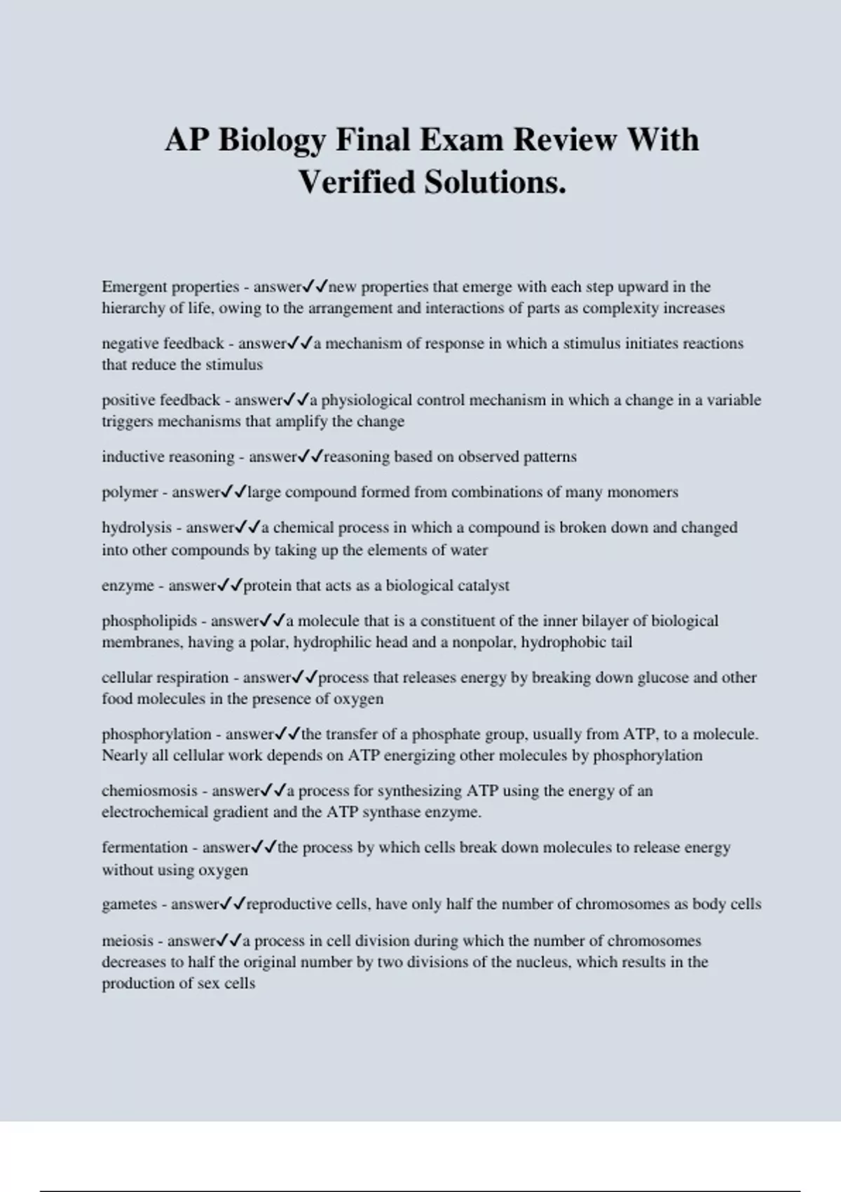 AP Biology Final Exam Review With Verified Solutions. Emergent properties - answernew properties that emerge with each step upward in the hierarchy of life, owing to the arrangement and interactions of parts as complexity increases negative feedback - answera mechanism of response in which a stimulus initiates reactions that reduce the stimulus positive feedback - answera physiological control mechanism in which a change in a variable triggers mechanisms that amplify the change inductive reasoning - answerreasoning based on observed patterns polymer - answerlarge compound formed from combinations of many monomers hydrolysis - answera chemical process in which a compound is broken down and changed into other compounds by taking up the elements of water enzyme - answerprotein that acts as a biological catalyst phospholipids - answera molecule that is a constituent of the inner bilayer of biological membranes, having a polar, hydrophilic head and a nonpolar, hydrophobic tail cellular respiration - answerprocess that releases energy by breaking down glucose and other food molecules in the presence of oxygen phosphorylation - answerthe transfer of a phosphate group, usually from ATP, to a molecule. Nearly all cellular work depends on ATP energizing other molecules by phosphorylation chemiosmosis - answera process for synthesizing ATP using the energy of an electrochemical gradient and the ATP synthase enzyme. fermentation - answerthe process by which cells break down molecules to release energy without using oxygen gametes - answerreproductive cells, have only half the number of chromosomes as body cells meiosis - answera process in cell division during which the number of chromosomes decreases to half the original number by two divisions of the nucleus, which results in the production of sex cells somatic cell - answercell that makes up all of the body tissues and organs, except gametes crossing over - answerthe interchange of sections between pairing homologous chromosomes during the prophase of meiosis transcription - answerprocess in which part of the nucleotide sequence of DNA is copied into a complementary sequence in mRNA codons - answera three-nucleotide sequence of DNA or mRNA that specifies a particular amino acid or termination signal; the basic unit of the genetic code. RNA splicing - answerprocess by which the introns are removed from RNA transcripts and the remaining exons are joined together mutations - answerrandom errors in gene replication that lead to a change in the sequence of nucleotides; the source of all genetic diversity repetitive DNA - answernucleotide sequences, usually noncoding, that are present in many copies in a eukaryotic genome. transposons - answersmall mobile DNA segments homeobox - answerone of various similar homeotic genes that are involved in bodily segmentation during embryonic development genome project - answerResearch and technology development effort aimed at mapping and sequencing some or all of the genome of human beings and other organisms adaptations - answerthe behaviors and physical characteristics that allow organisms to live successfully in their environments natural selection - answerprocess by which individuals that are better suited to their environment survive and reproduce most successfully vestigial structures - answerremnant of a structure that may have had an important function in a species' ancestors, but has no clear function in the modern species convergent evolution - answerprocess by which unrelated organisms independently evolve similarities when adapting to similar environments protists - answersingle-celled or simple multicellular eukaryotic organisms that generally do not fit in any other kingdom diatoms - answerunicellular algae that have a unique glass-like wall made of hydrated silica embedded in an organic matrix ciliates - answera group of protozoans that move by waving tiny, hair-like organelles called cilia amoeba - answerA type of protist characterized by great flexibility and the presence of pseudopodia gastrula - answeran embryonic stage in animal development encompassing the formation of three layers: ectoderm, mesoderm, and endoderm cephalization - answerthe concentration o