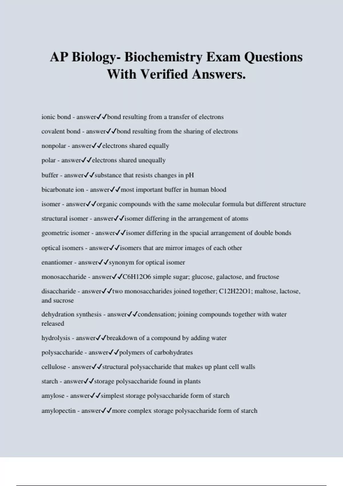 AP Biology- Biochemistry Exam Questions With Verified Answers.