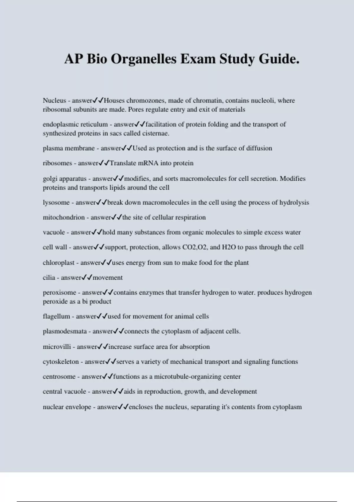 AP Bio Organelles Exam Study Guide. Nucleus - answerHouses chromozones, made of chromatin, contains nucleoli, where ribosomal subunits are made. Pores regulate entry and exit of materials endoplasmic reticulum - answerfacilitation of protein folding and the transport of synthesized proteins in sacs called cisternae. plasma membrane - answerUsed as protection and is the surface of diffusion ribosomes - answerTranslate mRNA into protein golgi apparatus - answermodifies, and sorts macromolecules for cell secretion. Modifies proteins and transports lipids around the cell lysosome - answerbreak down macromolecules in the cell using the process of hydrolysis mitochondrion - answerthe site of cellular respiration vacuole - answerhold many substances from organic molecules to simple excess water cell wall - answersupport, protection, allow