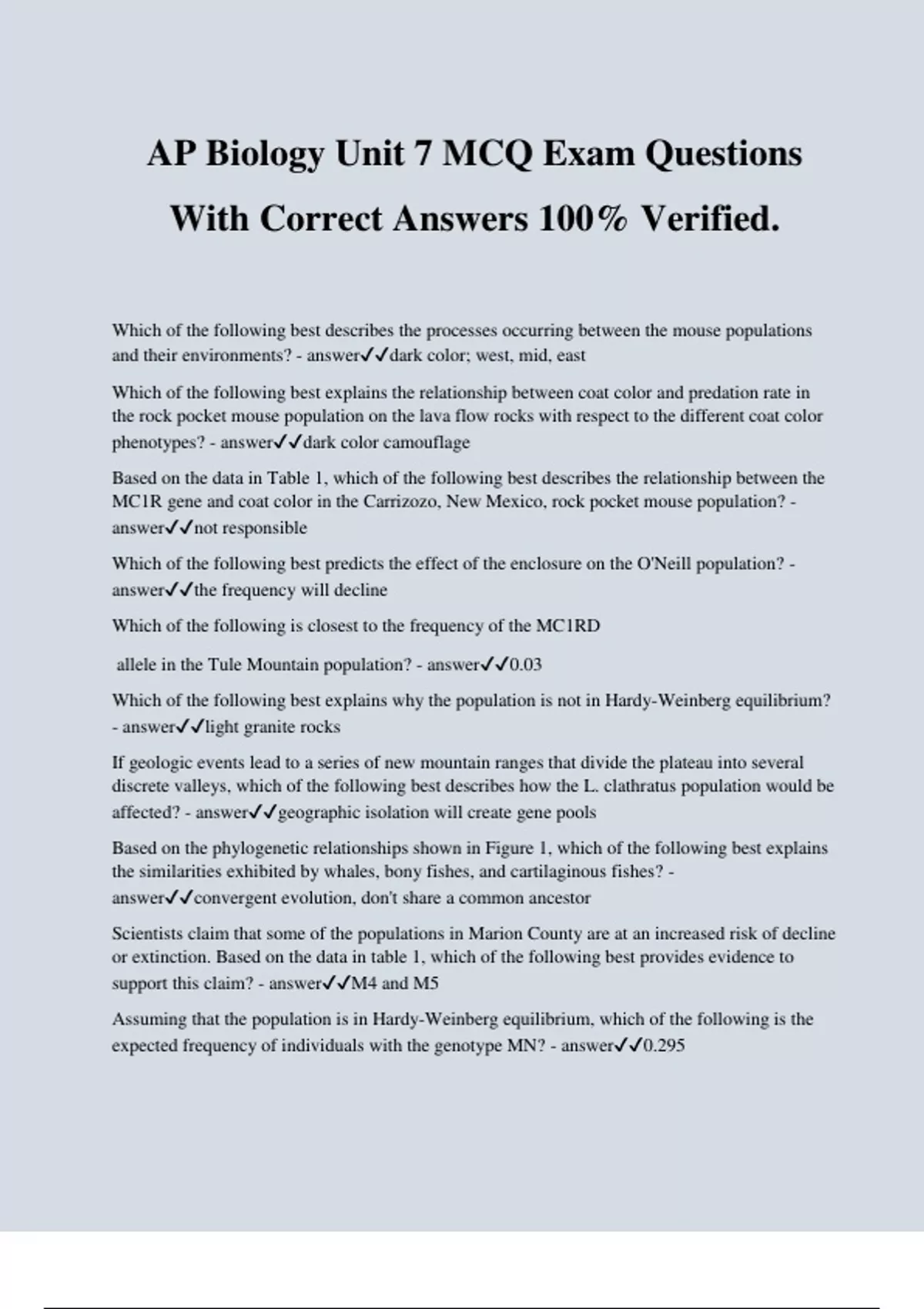 AP Biology Unit 7 MCQ Exam Questions With Correct Answers 100% Verified. Which of the following best describes the processes occurring between the mouse populations and their environments? - answerdark color; west, mid, east Which of the following best explains the relationship between coat color and predation rate in the rock pocket mouse population on the lava flow rocks with respect to the different coat color phenotypes? - answerdark color camouflage Based on the data in Table 1, which of the following best describes the relationship between the MC1R gene and coat color in the Carrizozo, New Mexico, rock pocket mouse population? - answernot responsible Which of the following best predicts the effect of the enclosure on the O'Neill population? - answerthe frequency will decline Which of the following is closest to the frequency of the MC1RD allele in the Tule Mountain population? - answer0.03 Which of the following best explains why the population is not in Hardy-Weinberg equilibrium? - answerlight granite rocks If geologic events lead to a series of new mountain ranges that divide the plateau into several discrete valleys, which of the following best describes how the L. clathratus population would be affected? - answergeographic isolation will create gene pools Based on the phylogenetic relationships shown in Figure 1, which of the following best explains the similarities exhibited by whales, bony fishes, and cartilaginous fishes? - answerconvergent evolution, don't share a common ancestor Scientists claim that some of the populations in Marion County are at an increased risk of decline or extinction. Based on the data in table 1, which of the following best provides evidence to support this claim? - answerM4 and M5 Assuming that the population is in Hardy-Weinberg equilibrium, which of the following is the expected frequency of individuals with the genotype MN? - answer0.295