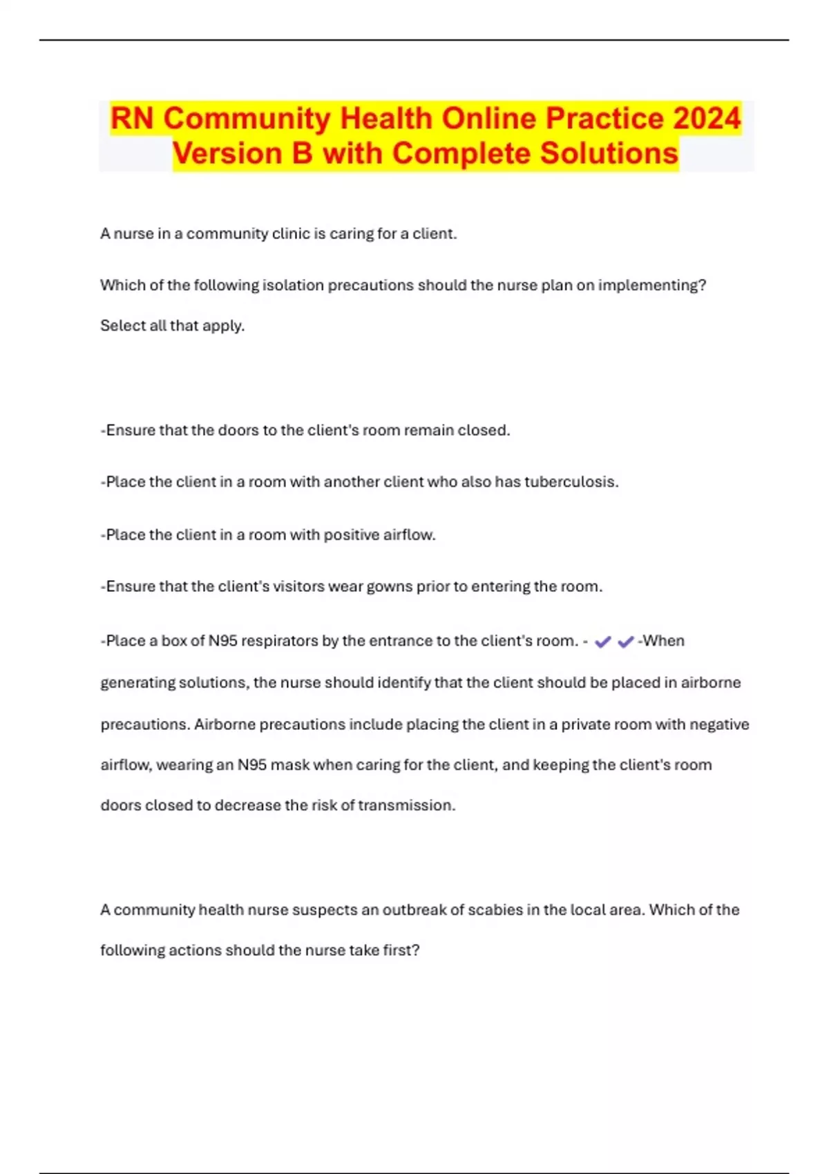 RN Community Health Online Practice 2024 Version B with Complete Solutions A nurse in a community clinic is caring for a client. Which of the following isolation precautions should the nurse plan on implementing? Select all that apply. -Ensure that the doors to the client's room remain closed. -Place the client in a room with another client who also has tuberculosis. -Place the client in a room with positive airflow. -Ensure that the client's visitors wear gowns prior to entering the room. -Place a box of N95 respirators by the entrance to the client's room. - -When generating solutions, the nurse should identify that the client should be placed in airborne precautions. Airborne precautions include placing the client in a private room with negative airflow, wearing an N95 mask when caring for the client, and keeping the client's room doors closed to decrease the risk of transmission. A community health nurse suspects an outbreak of scabies in the local area. Which of the following actions should the nurse take first? a. Educate the community about disease transmission. b. Determine the incidence rate. c. Institute prophylactic treatment. d. Discuss treatment plans with the clients' families. - -b. Determine the incidence rate. The first action the nurse should take when using the nursing process is to perform an assessment. The nurse should determine the number of new cases of scabies in the community for comparison to prior incidence data in order to monitor for an increase. A nurse is caring for a client who has terminal lung cancer and is receiving hospice care. Which of the following statements should the nurse identify as an indication that the client is in the denial stage of the grief process? a. "I'm looking forward to my daughter's wedding next year." b. "I don't deserve to die. This just isn't fair." c. "If I could just make it through this, I'd never smoke again." d. "Next week, I will start making pl