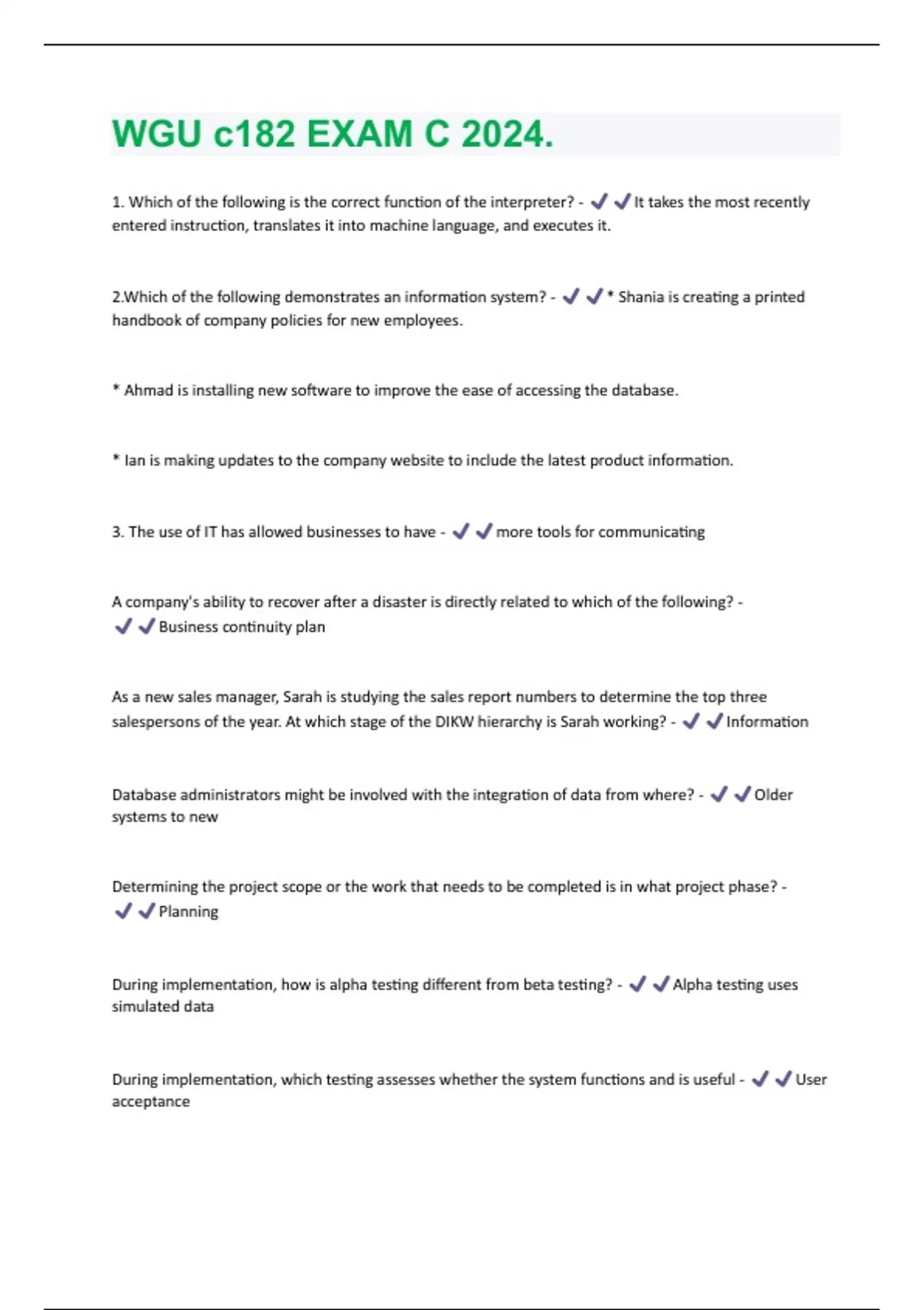 1. Which of the following is the correct function of the interpreter? - It takes the most recently entered instruction, translates it into machine language, and executes it. 2.Which of the following demonstrates an information system? - * Shania is creating a printed handbook of company policies for new employees. * Ahmad is installing new software to improve the ease of accessing the database. * Ian is making updates to the company website to include the latest product information. 3. The use of IT has allowed businesses to have - more tools for communicating A company's ability to recover after a disaster is directly related to which of the following? - Business continuity plan As a new sales manager, Sarah is studying the sales report numbers to determine the top three salespersons of the year. At which stage of the DIKW hierarchy is Sarah working? - Information Database administrators might be involved with the integration of data from where? - Older systems to new Determining the project scope or the work that needs to be completed is in what project phase? - Planning During implementation, how is alpha testing different from beta testing? - Alpha testing uses simulated data During implementation, which testing assesses whether the system functions and is useful - User acceptanceDuring implementation, which testing method is performed by the end user (in a limited fashion) using actual data in the real working environment? - Beta During which generation did computers begin to see widespread use in homes and offices? - Fourth generation Ensuring that data is accessible, and information is available when needed is an example of - availability How does a wide area network (WAN) enhance the business ecosystem? Select two that apply. - *Employees in different locations can share software. *Team members can review files on the shared drive synchronously. In order for a relational database to work, at least one of the fields has to contain unique values. What is the name of this field? - Unique identifier