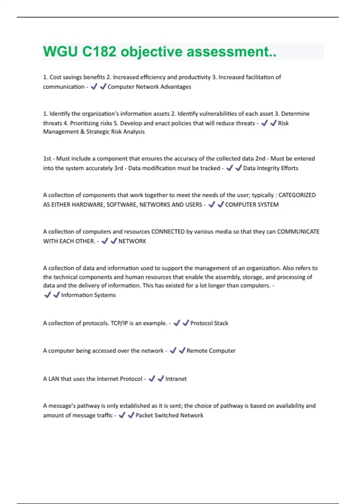 1. Cost savings benefits 2. Increased efficiency and productivity 3. Increased facilitation of communication - Computer Network Advantages 1. Identify the organization's information assets 2. Identify vulnerabilities of each asset 3. Determine threats 4. Prioritizing risks 5. Develop and enact policies that will reduce threats - Risk Management & Strategic Risk Analysis 1st - Must include a component that ensures the accuracy of the collected data 2nd - Must be entered into the system accurately 3rd - Data modification must be tracked - Data Integrity Efforts A collection of components that work together to meet the needs of the user; typically : CATEGORIZED AS EITHER HARDWARE, SOFTWARE, NETWORKS AND USERS - COMPUTER SYSTEM A collection of computers and resources CONNECTED by various media so that they can COMMUNICATE WITH EACH OTHER. - NETWORK A collection of data and information used to support the management of an organization. Also refers to the technical components and human resources that enable the assembly, storage, and processing of data and the delivery of information. This has existed for a lot longer than computers. - Information Systems A collection of protocols. TCP/IP is an example. - Protocol Stack A computer being accessed over the network - Remote Computer A LAN that uses the Internet Protocol - Intranet A message's pathway is only established as it is sent; the choice of pathway is based on availability and amount of message traffic - Packet Switched NetworkA software emulator program that permits a computer user to use multiple computers and multiple platforms without the expense of purchasing multiple computers; allows a user to run software for different OS platform in their computer that would not otherwise be able to run that software; this allows multiple users on a network to access the software to support collaboration. - Virtual Machine (VM) A type of programming language for which most of its implementations EXECUTES INSTRUCTIONS DIRECTLY AND FREELY, without previously compiling a program into machine-language instructions. - Interpreted Language (Code) Administration and Support - IT Professional Roles All peripheral devices where long term storage devices are used. - i/o Subsystem