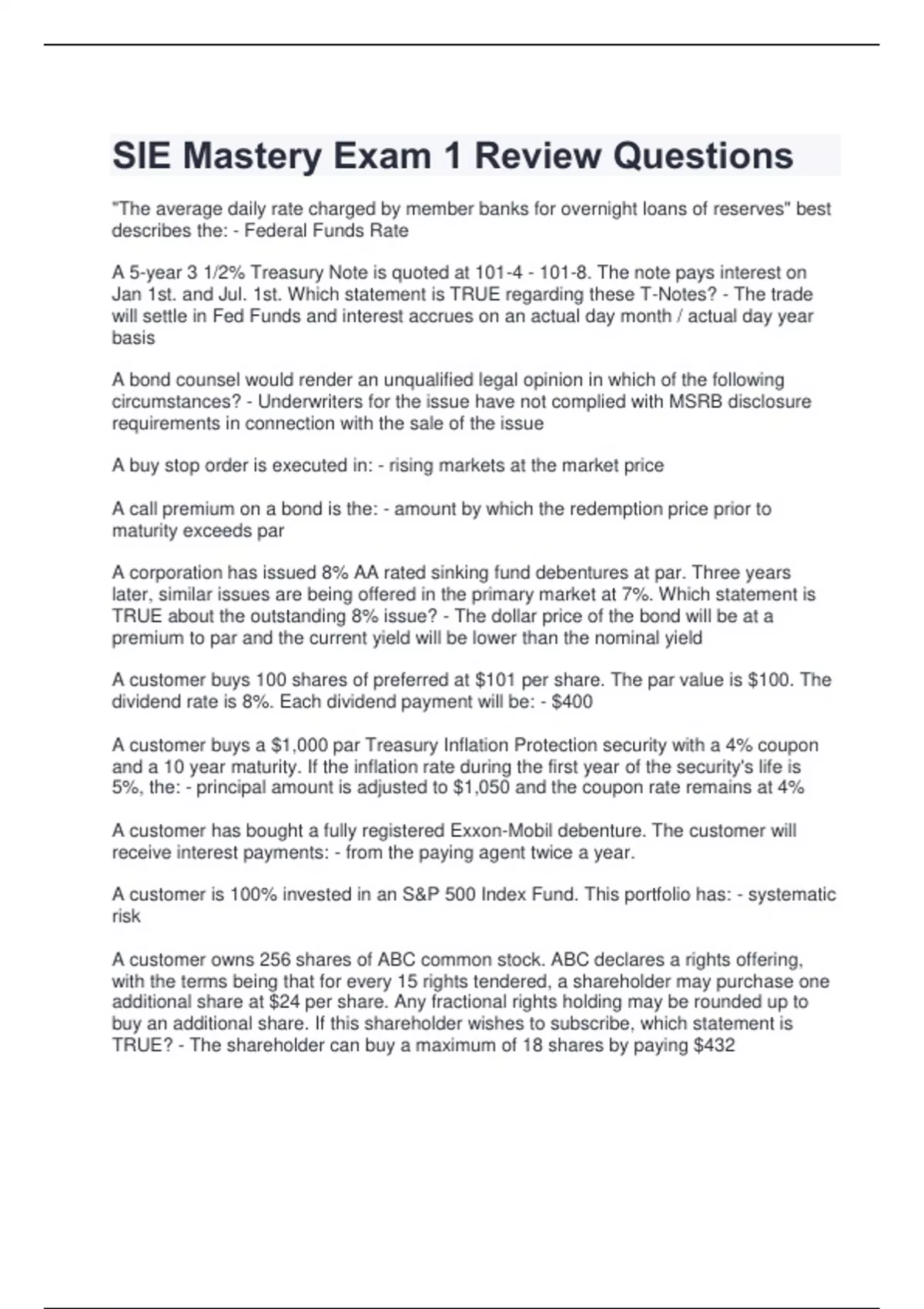 "The average daily rate charged by member banks for overnight loans of reserves" best describes the: - Federal Funds Rate A 5-year 3 1/2% Treasury Note is quoted at . The note pays interest on Jan 1st. and Jul. 1st. Which statement is TRUE regarding these T-Notes? - The trade will settle in Fed Funds and interest accrues on an actual day month / actual day year basis A bond counsel would render an unqualified legal opinion in which of the following circumstances? - Underwriters for the issue have not complied with MSRB disclosure requirements in connection with the sale of the issue A buy stop order is executed in: - rising markets at the market price A call premium on a bond is the: - amount by which the redemption price prior to maturity exceeds par A corporation has issued 8% AA rated sinking fund debentures at par. Three years later, similar issues are being offered in the primary market at 7%. Which statement is TRUE about the outstanding 8% issue? - The dollar price of the bond will be at a premium to par and the current yield will be lower than the nominal yield A customer buys 100 shares of preferred at $101 per share. The par value is $100. The dividend rate is 8%. Each dividend payment will be: - $400 A customer buys a $1,000 par Treasury Inflation Protection security with a 4% coupon and a 10 year maturity. If the inflation rate during the first year of the security's life is 5%, the: - principal amount is adjusted to $1,050 and the coupon rate remains at 4% A customer has bought a fully registered Exxon-Mobil debenture. The customer will receive interest payments: - from the paying agent twice a year. A customer is 100% invested in an S&P 500 Index Fund. This portfolio has: - systematic risk A customer owns 256 shares of ABC common stock. ABC declares a rights offering, with the terms being that for every 15 rights tendered, a shareholder may purchase one additional share at $24 per share. Any fractional rights holding may be rounded up to buy an additional share. If this shareholder wishes to subscribe, which statement is TRUE? - The shareholder can buy a maximum of 18 shares by paying $432