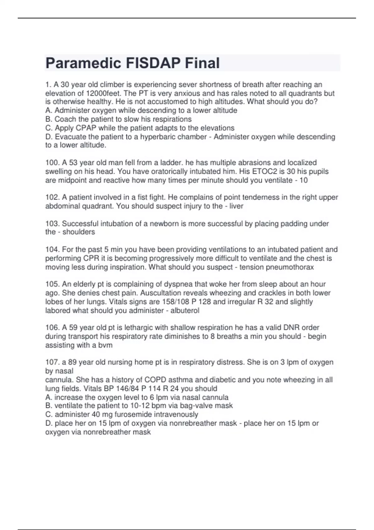 1. A 30 year old climber is experiencing sever shortness of breath after reaching an elevation of 12000feet. The PT is very anxious and has rales noted to all quadrants but is otherwise healthy. He is not accustomed to high altitudes. What should you do? A. Administer oxygen while descending to a lower altitude B. Coach the patient to slow his respirations C. Apply CPAP while the patient adapts to the elevations D. Evacuate the patient to a hyperbaric chamber - Administer oxygen while descending to a lower altitude. 100. A 53 year old man fell from a ladder. he has multiple abrasions and localized swelling on his head. You have oratorically intubated him. His ETOC2 is 30 his pupils are midpoint and reactive how many times per minute should you ventilate - 10 102. A patient involved in a fist fight. He complains of point tenderness in the right upper abdominal quadrant. You should suspect injury to the - liver 103. Successful intubation of a newborn is more successful by placing padding under the - shoulders 104. For the past 5 min you have been providing ventilations to an intubated patient and performing CPR it is becoming progressively more difficult to ventilate and the chest is moving less during inspiration. What should you suspect - tension pneumothorax 105. An elderly pt is complaining of dyspnea that woke her from sleep about an hour ago. She denies chest pain. Auscultation reveals wheezing and crackles in both lower lobes of her lungs. Vitals signs are 158/108 P 128 and irregular R 32 and slightly labored what should you administer - albuterol 106. A 59 year old pt is lethargic with shallow respiration he has a valid DNR order during transport his respiratory rate diminishes to 8 breaths a min you should - begin assisting with a bvm 107. a 89 year old nursing home pt is in respiratory distress. She is on 3 lpm of oxygen by nasal cannula. She has a history of COPD asthma and diabetic and you note wheezing in all lung fields. Vitals BP 146/84 P 114 R 24 you should A. increase the oxygen level to 6 lpm via nasal cannula B. ventilate the patient to 10-12 bpm via bag-valve mask C. administer 40 mg furosemide intravenously D. place her on 15 lpm of oxygen via nonrebreather mask - place her on 15 lpm or oxygen via nonrebreather mask
