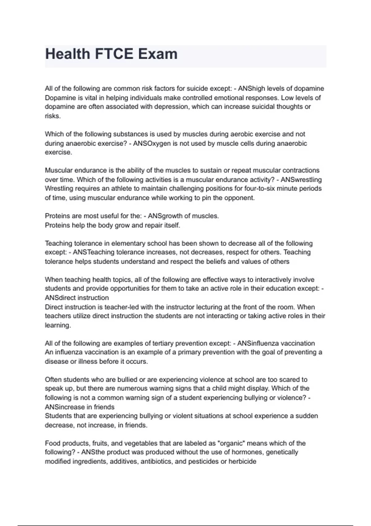 Health FTCE Exam questions and answers rated A+ by experts 2024/2025