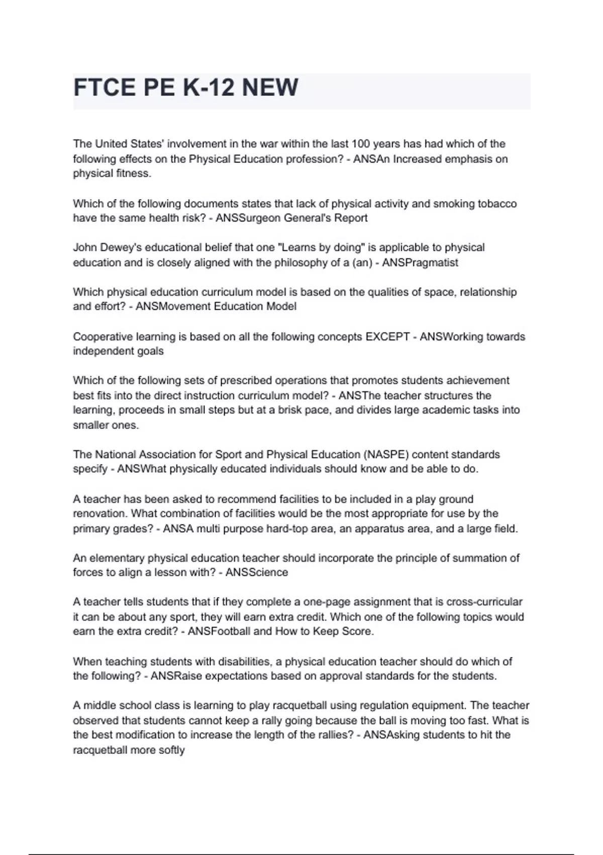 FTCE PE K-12 NEW questions and answers rated A+ by experts 2024/2025