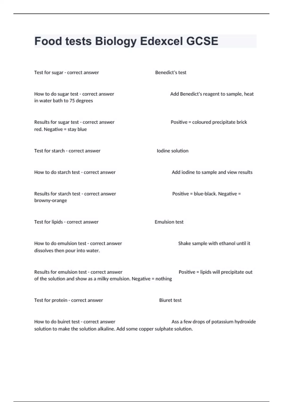 Test for sugar - correct answer Benedict's test How to do sugar test - correct answer Add Benedict's reagent to sample, heat in water bath to 75 degrees Results for sugar test - correct answer Positive = coloured precipitate brick red. Negative = stay blue Test for starch - correct answer Iodine solution How to do starch test - correct answer Add iodine to sample and view results Results for starch test - correct answer Positive = blue-black. Negative = browny-orange Test for lipids - correct answer Emulsion test How to do emulsion test - correct answer Shake sample with ethanol until it dissolves then pour into water. Results for emulsion test - correct answer Positive = lipids will precipitate out of the solution and show as a milky emulsion. Negative = nothing Test for protein - correct answer Biuret test How to do buiret test - correct answer Ass a few drops of potassium hydroxide solution to make the solution alkaline. Add some copper sulphate solution. Results for biuret test - correct answer Negative = stay blue Positive = turn purple