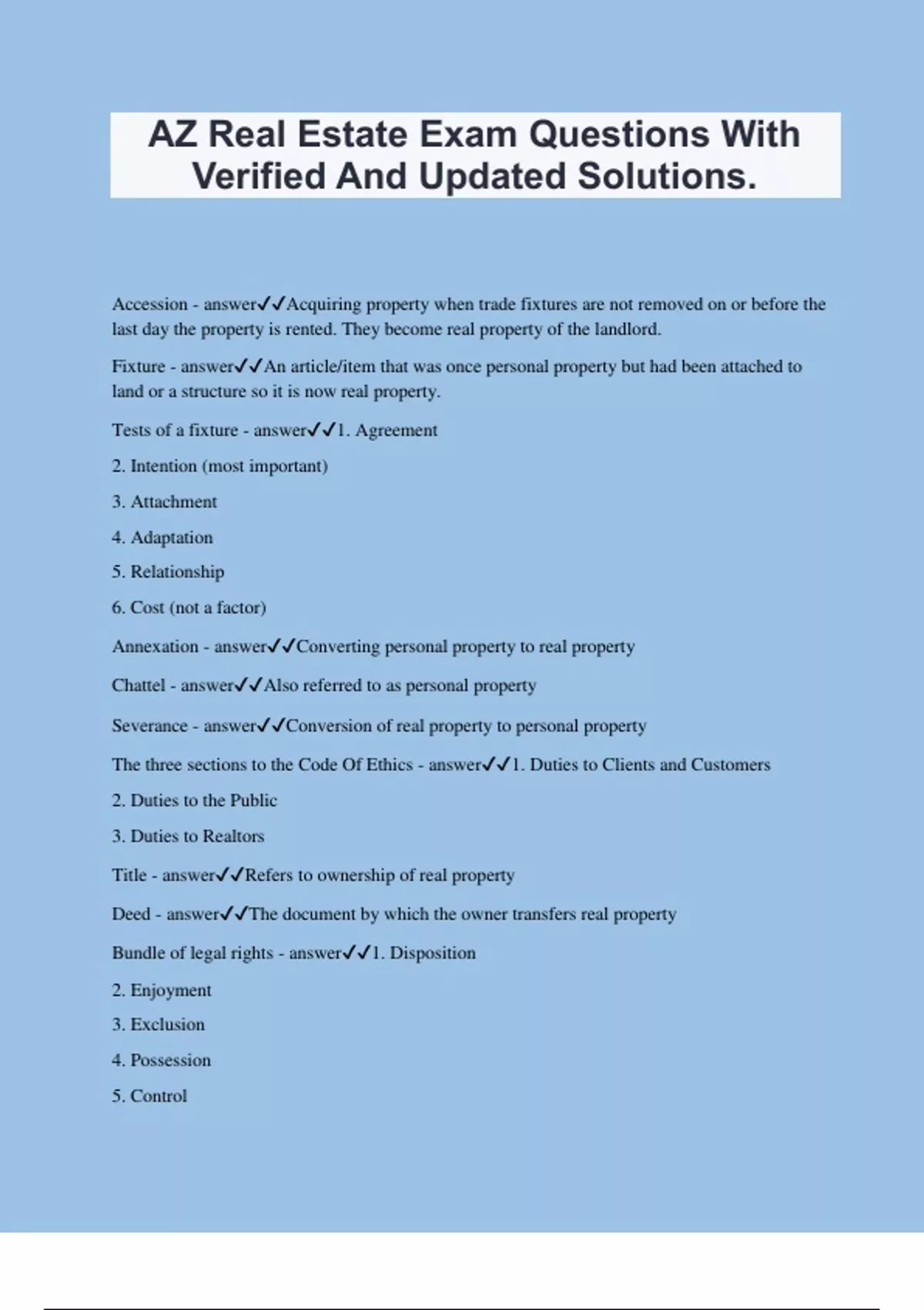 AZ Real Estate Exam Questions With Verified And Updated Solutions. Accession - answerAcquiring property when trade fixtures are not removed on or before the last day the property is rented. They become real property of the landlord. Fixture - answerAn article/item that was once personal property but had been attached to land or a structure so it is now real property. Tests of a fixture - answer1. Agreement 2. Intention (most important) 3. Attachment 4. Adaptation 5. Relationship 6. Cost (not a factor) Annexation - answerConverting personal property to real property Chattel - answerAlso referred to as personal property Severance - answerConversion of real property to personal property The three sections to the Code Of Ethics - answer1. Duties to Clients and Customers 2. Duties to the Public 3. Duties to Realtors Title - answerRefers to ownership of real property Deed - answerThe document by which the owner transfers real property Bundle of legal rights - answer1. Disposition 2. Enjoyment 3. Exclusion 4. Possession 5. Control Appurtenance - answerThe right or privilege associated with the property but not necessarily a part of it Emblements - answerCultivated crops Situs - answerPeoples preference for certain areas Price-fixing - answerSetting commission rates. This is illegal as part of the Sherman antitrust act Three types of real estate licenses - answer1. The real estate entity 2. The real estate broker 3. The real estate salesperson Brokerage - answerThe real estate entity Physical characteristics of real estate - answer1. Immobility 2. Indestructibility 3. Non-homogeneity Non-homogeneity - answerNo two parcels are exactly the same or in the same location Economic characteristics of real estate - answer1. Scarcity 2. Improvements 3. Permanence of investment 4. Situs Land - answerSurface of the earth, below to the center of the earth, above to infinity and natural things permanently attached Real estate - answerLand, plus artificial things attached Real property - answerReal estate plus legal interests, rights and privileges associated with ownership. Includes bundle of rights Trade fixtures - answerUsed in the operation of the business. Owned by the tenants and attached to a rented space for purpose of conducting business Bill of sale - answerThe document used to transfer ownership of personal property Asset - answerSomething of value Severalty - answerOwning real estate alone Tenants in common - answerMost widely used form of co-ownership 1. Time 2. Title 3. Interest 4. Possession - answerFour unities that are required to create a valid joint tenancy Trustor - answerThe person who is the creator of the trust Trustee - answerThe trust manager Beneficiary - answerThe person or entity that benefits from a trust Trust - answerThe type of ownership of that can own assets both real and personal property Single-family residence - answerEach residence is located on an individual a lot Blue laws - answerLaws that restrict transactions of business on Sundays and certain religious holidays Blue sky laws - answerSecurities laws designed to protect the public from fraudulent practices in the promotion and sale of securities Fiduciary - answerRelationship that implies a position of trust and confidence Enabling declaration - answerThe legal document that the developer of a condominium must file and record in order to create a condominium under state law Partition action - answerThe dividing of co-owners interest in real property, action often taken when parties cannot reach agreement Rights of survivorship - answerSurviving co-owners succeeds to all rights, title and interest of the deceased co-owner without the need for probate proceedings 1. Police power 2. Eminent domain 3. Taxation 4. Escheat - answerThe four government powers that have been designed for the purpose of protecting the public health safety and welfare of the people Police power - answerNo compensation, to protect the people Eminent domain - answerWith just compensation, for the good of the people Taxation - answerCollect money to run the government