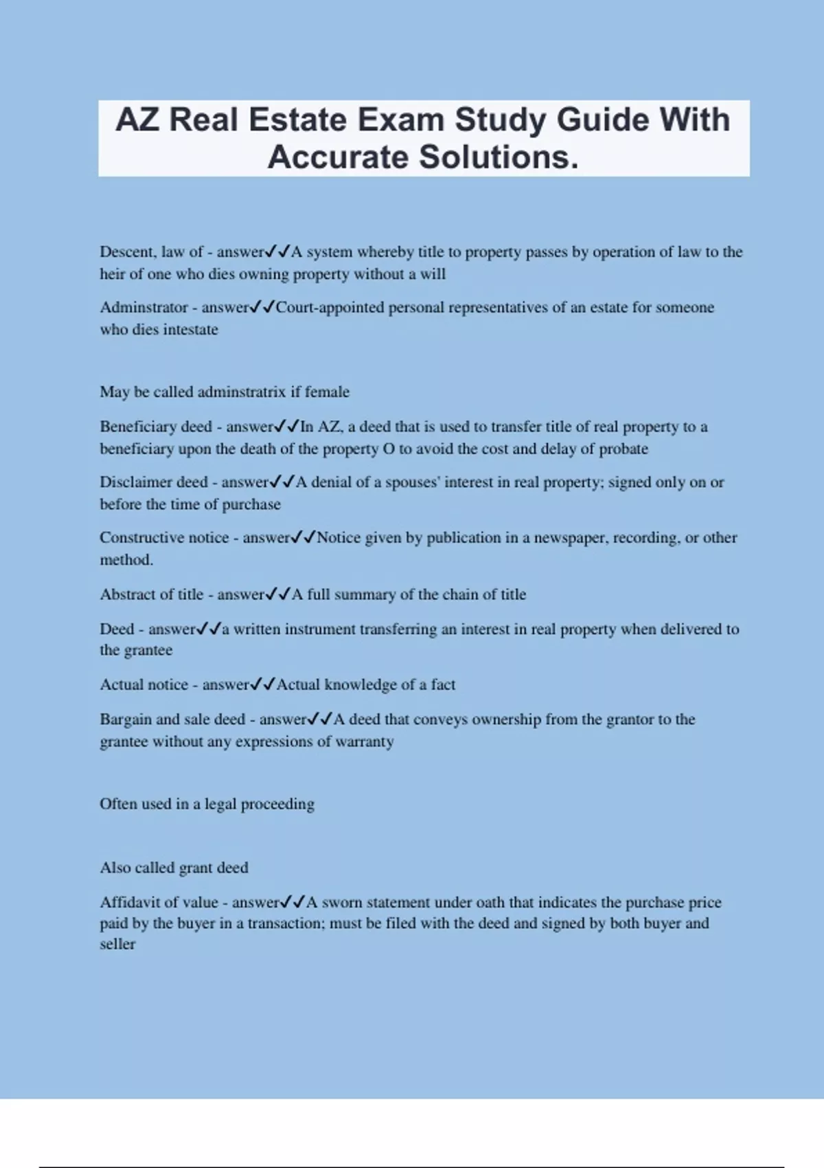 AZ Real Estate Exam Study Guide With Accurate Solutions. Descent, law of - answerA system whereby title to property passes by operation of law to the heir of one who dies owning property without a will Adminstrator - answerCourt-appointed personal representatives of an estate for someone who dies intestate May be called adminstratrix if female Beneficiary deed - answerIn AZ, a deed that is used to transfer title of real property to a beneficiary upon the death of the property O to avoid the cost and delay of probate Disclaimer deed - answerA denial of a spouses' interest in real property; signed only on or before the time of purchase Constructive notice - answerNotice given by publication in a newspaper, recording, or other method. Abstract of title - answerA full summary of the chain of title Deed - answera written instrument transferring an interest in real property when delivered to the grantee Actual notice - answerActual knowledge of a fact Bargain and sale deed - answerA deed that conveys ownership from the grantor to the grantee without any expressions of warranty Often used in a legal proceeding Also called grant deed Affidavit of value - answerA sworn statement under oath that indicates the purchase price paid by the buyer in a transaction; must be filed with the deed and signed by both buyer and seller Executor - answerA person appointed by the testator in a will to carry out the terms of the will and to dispose of any property to the provisions of the will Chain of title - answerThe complete record of all deeds, liens, etc., as disclosed in the public record Delivery and acceptance of Deed - answerThe legal act of transferring title to property to the grantee. Alienation - answerThe transfer of ownership or an interest in property from one person to another, by any means. Adverse possession - answerAcquiring title to land because of a long-term, open and notorious use of the land. The time period required is 10 years Executor's deed - answerA deed signed by the personal representative of an estate, as assigned by the testator General Warranty Deed - answerA deed in which the grantor warrants the title against any and all defects that might have arisen before or during his or her period of ownership Grantee - answerA person receiving a grant of real property from the grantor Grantor - answerA person transferring title to real property Involuntary alienation - answerThe transfer of title to property during the O's lifetime without his consent Lender's Policy - answerA title insurance policy issued for the benefit of a lender as well as any future holder of the loan Generally, a lender's policy, unlike an O's policy, cover's mechanic's liens and encroachments Owner's policy - answerA type of title insurance issued in the name of the property O. Coverage runs from the time of the purchase for as long a s the policyholder owns the property Also called: Standard Policy Patent deed - answerA deed from the government to a private individual Preliminary title report - answerA search of liens, encroachments, easements and any recorded documents in the county records in order to issue title insurances