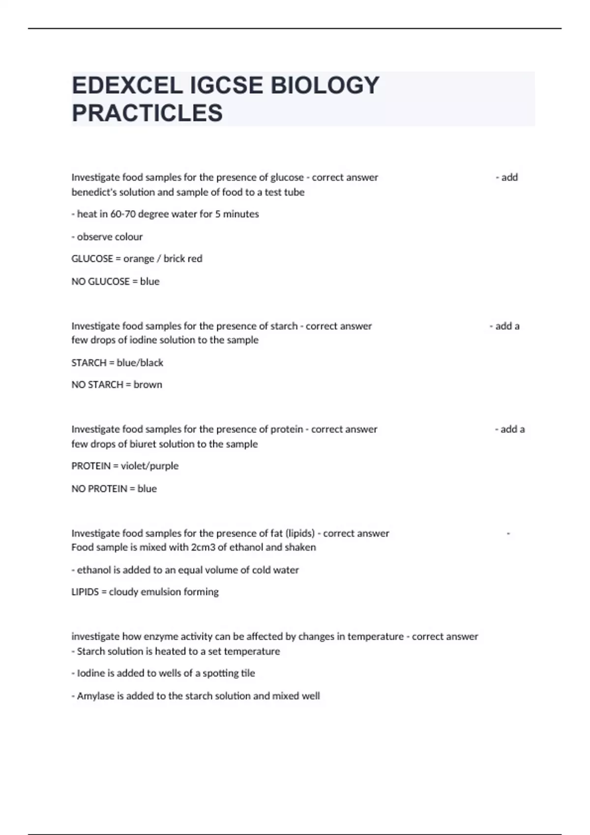 Investigate food samples for the presence of glucose - correct answer - add benedict's solution and sample of food to a test tube - heat in 60-70 degree water for 5 minutes - observe colour GLUCOSE = orange / brick red NO GLUCOSE = blue Investigate food samples for the presence of starch - correct answer - add a few drops of iodine solution to the sample STARCH = blue/black NO STARCH = brown Investigate food samples for the presence of protein - correct answer - add a few drops of biuret solution to the sample PROTEIN = violet/purple NO PROTEIN = blue Investigate food samples for the presence of fat (lipids) - correct answer - Food sample is mixed with 2cm3 of ethanol and shaken - ethanol is added to an equal volume of cold water LIPIDS = cloudy emulsion forming investigate how enzyme activity can be affected by changes in temperature - correct answer - Starch solution is heated to a set temperature - Iodine is added to wells of a spotting tile - Amylase is added to the starch solution and mixed well - Every minute, droplets of solution are added to a new well of iodine solution - This is continued until the iodine stops turning blue-black (this means there is no more starch left in the solution as the amylase has broken it all down) - Time taken for the reaction to be completed is recorded - Experiment is repeated at different temperatures - The quicker the reaction is completed, the faster the enzyme is working investigate how enzyme activity can be affected by changes in pH - correct answer Place single drops of Iodine solution in rows on the tile Label a test tube with the pH to be tested Use the syringe to place 2cm3 of amylase in the test tube Add 1cm3 of buffer solution to the test tube using a syringe Use another test tube to add 2cm3 of starch solution to the amylase and buffer solution, start the stopwatch whilst mixing using a pipette After 10 seconds, use pipette to place one drop of mixture on the first drop of iodine, which should turn blue-black Wait another 10 seconds and place another drop of mixture on the second drop of iodine Repeat every 10 seconds until iodine solution remains orange-brown Repeat experiment at different pH values - the less time the iodine solution takes to remain orange-brown, the quicker all the starch has been digested and so the better the enzyme works at that pH investigate diffusion and osmosis using living and non-living systems - correct answer Diffusion in a Non-Living System - A crystal (Potassium permanganate) is added to water (solvent) - The potassium permanganate particles will diffuse with solvent particles - The potassium permanganate particles will be less concentrated in one place in the end, so the colour will not be as deep Diffusion in a Living System During inhalation, oxygen rich air enters alveoli There is a higher concentration of oxygen in the alveoli than in the blood running past the alveoli Oxygen will diffuse out of alveoli down the concentration gradient into blood At the same time, there is a higher concentration of carbon dioxide in the blood (from respiration) than in the alveoli Carbon dioxide will diffuse out of blood down the concentration gradient into the alveoli