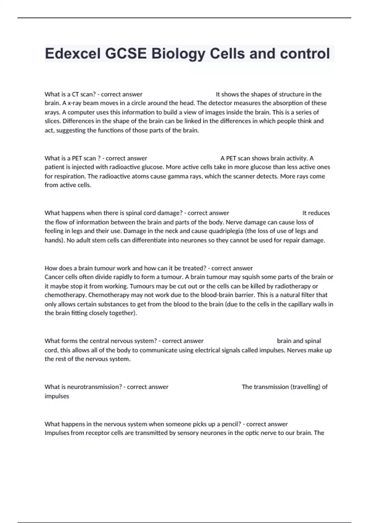 What is a CT scan? - correct answer It shows the shapes of structure in the brain. A x-ray beam moves in a circle around the head. The detector measures the absorption of these xrays. A computer uses this information to build a view of images inside the brain. This is a series of slices. Differences in the shape of the brain can be linked in the differences in which people think and act, suggesting the functions of those parts of the brain. What is a PET scan ? - correct answer A PET scan shows brain activity. A patient is injected with radioactive glucose. More active cells take in more glucose than less active ones for respiration. The radioactive atoms cause gamma rays, which the scanner detects. More rays come from active cells. What happens when there is spinal cord damage? - correct answer It reduces the flow of information between the brain and parts of the body. Nerve damage can cause loss of feeling in legs and their use. Damage in the neck and cause quadriplegia (the loss of use of legs and hands). No adult stem cells can differentiate into neurones so they cannot be used for repair damage. How does a brain tumour work and how can it be treated? - correct answer Cancer cells often divide rapidly to form a tumour. A brain tumour may squish some parts of the brain or it maybe stop it from working. Tumours may be cut out or the cells can be killed by radiotherapy or chemotherapy. Chemotherapy may not work due to the blood-brain barrier. This is a natural filter that only allows certain substances to get from the blood to the brain (due to the cells in the capillary walls in the brain fitting closely together). What forms the central nervous system? - correct answer brain and spinal cord, this allows all of the body to communicate using electrical signals called impulses. Nerves make up the rest of the nervous system. What is neurotransmission? - correct answer The transmission (travelling) of impulses What happens in the nervous system when someone picks up a pencil? - correct answer Impulses from receptor cells are transmitted by sensory neurones in the optic nerve to our brain. The brain processes these impulses and sees the pencil. It sends more impulses to the muscles, the response. Muscles in the hand receive the impulses and make the hand move to pick up the pencil. What is a sensory neurone and how is it specialised? - correct answer It carries impulses from receptor cells towards the CNS. A receptor cell impulse passes into a tiny branch called a dendrite. It is then transmitted through the dendron and axon. A series of axon terminals allow impulses to be transmitted to other neurones. A fatty layer surrounds the dendron and the axon called the myelin sheath, this electrically insulates a neurone from neighbouring neurones, stopping the signal loosing energy. This also makes an impulse jump between the gaps in the myelin, speeding up neurotransmission. What are cones? - correct answer Cones are receptor cells that are sensitive the colour of light. Cones generate impulses in sensory neurones, which leads to the brains through the optic nerve. The information from cones is combined in the brain to produce all the colours. What are rods? - correct answer They detect differences in light intensity, not colour. Rods work well in dim light, but cones work well in bright light. This is why colour vision does not work well in dim light. What does the iris and pupil do? - correct answer The pupil is the dark area in the middle of the eye where light enters. The amount of light that enters is controlled by the iris which can constrict (decrease the diameter) of the pupil or dilate it ( increase the diameter) of the pupil. Bright light can damage receptor cells in the retina What does the cornea and lens do? - correct answer It focuses light rays entering the eye onto a point in the retina to produce a clear image. It bends the light rays to bring them together. The lens then fine-tunes the focusing. What does the ciliary muscles do? - correct answer It makes the lens fatter to focus light from near objects. It makes the lens thinner to focus light from objects with distance. What is Myopia and what can you do for it? - correct answer It is short-sightedness and it is a condition where light focuses in front of the retina instead of on it. A reason for this could be that the eyeball is too long or the cornea is too curved and it bends light more. A concave lens is placed in front of the eye, so that the lens refracts the incoming rays of light, so they diverge more. This is a diverging lens What is Hyperopia and what can you do for it? - correct answer It is long-sightedness and it is cause when light focuses behind the retina. This could be because the eyeball is too short. To fix this, a convex lens is placed in front of the eye. The lens refracts the incoming rays of light so that they converge more before entering the eye. This is is converging lens What is a cataract? - correct answer When a protein builds up inside the lens and makes it cloudy. To fix this you can replace the lens with a plastic one. What does the motor neurone do? - correct answer They carry impulses from the CNS to effectors. The dendrites receive impulses from other neurones and the axon terminals pass impulses to effector cells. It does not have a dendron. What does the relay neurone do? - correct answer They are short impulses found in the spinal cord. They link motor and sensory neurones together and they make up most of the nerve tissue in the brain. It does not have a dendron What is a synapse? - correct answer At a synapse, a neurone meets another neurone. When an impulse reaches the axon terminal, a neurotransmitter substance is released into the gap. This is detected by the next neurone which generates an impulse. Synapses slow transmission, however they are useful because neurotransmitters are only released from axon terminals and so impulses only flow in one direction. They also allow many fresh i
