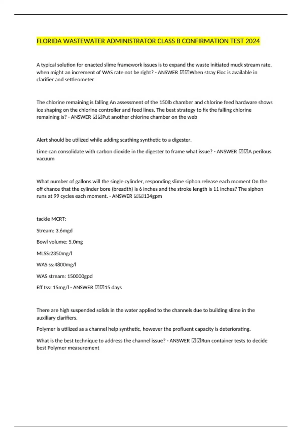FLORIDA WASTEWATER ADMINISTRATOR CLASS B CONFIRMATION TEST 2024 A typical solution for enacted slime framework issues is to expand the waste initiated muck stream rate, when might an increment of WAS rate not be right? - ANSWER ☑☑When stray Floc is available in clarifier and settleometer The chlorine remaining is falling An assessment of the 150lb chamber and chlorine feed hardware shows ice shaping on the chlorine controller and feed lines. The best strategy to fix the falling chlorine remaining is? - ANSWER ☑☑Put another chlorine chamber on the web Alert should be utilized while adding scathing synthetic to a digester. Lime can consolidate with carbon dioxide in the digester to frame what issue? - ANSWER ☑☑A perilous vacuum What number of gallons will the single cylinder, responding slime siphon release each moment On the off chance that the cylinder bore (breadth) is 6 inches and the stroke length is 11 inches? The siphon runs at 99 cycles each moment. - ANSWER ☑☑134gpm tackle MCRT: Stream: 3.6mgd Bowl volume: 5.0mg MLSS:2350mg/l WAS ss:4800mg/l W