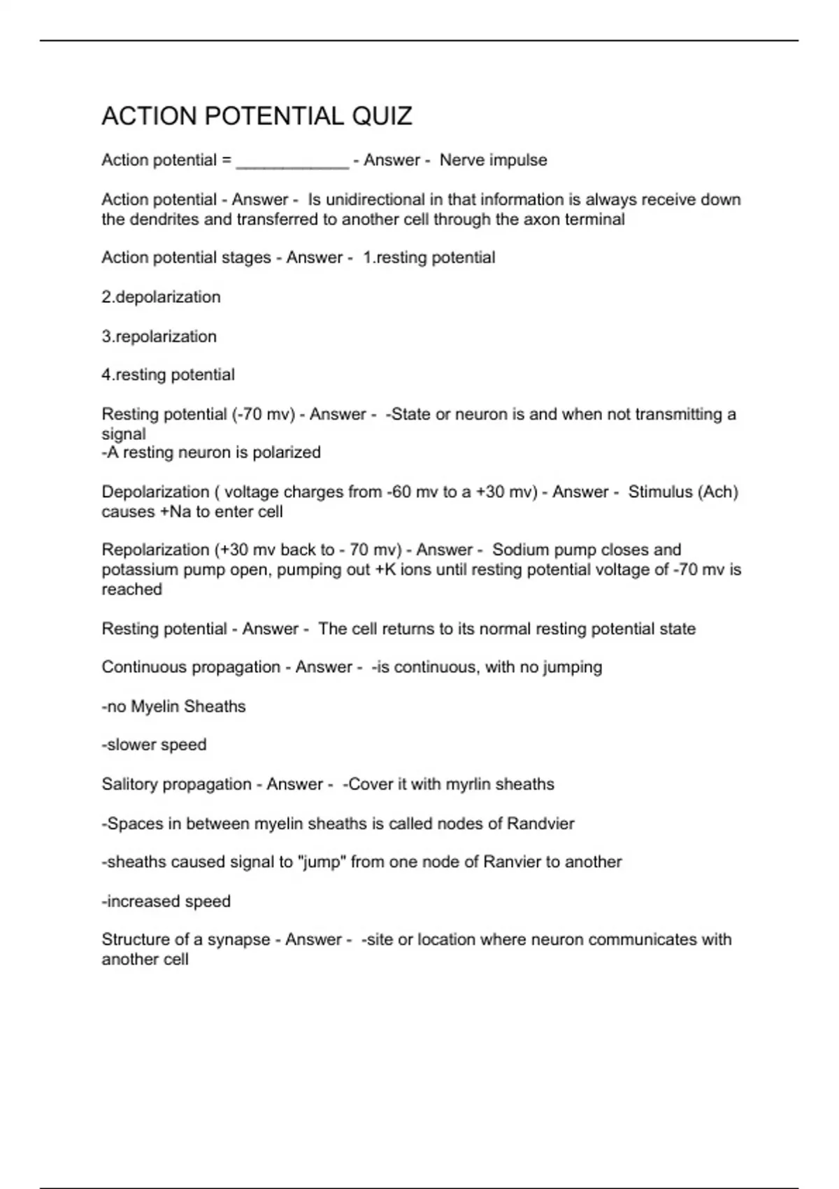 Action potential = ____________ - Answer - Nerve impulse Action potential - Answer - Is unidirectional in that information is always receive down the dendrites and transferred to another cell through the axon terminal Action potential stages - Answer - ng potential arization arization ng potential Resting potential (-70 mv) - Answer - -State or neuron is and when not transmitting a signal -A resting neuron is polarized Depolarization ( voltage charges from -60 mv to a +30 mv) - Answer - Stimulus (Ach) causes +Na to enter cell Repolarization (+30 mv back to - 70 mv) - Answer - Sodium pump closes and potassium pump open, pumping out +K ions until resting potential voltage of -70 mv is reached Resting potential - Answer - The cell returns to its normal resting potential state Continuous propagation - Answer - -is continuous, with no jumping -no Myelin Sheaths -slower speed Salitory propagation - Answer - -Cover it with myrlin sheaths -Spaces in between myelin sheaths is called nodes of Randvier -sheath