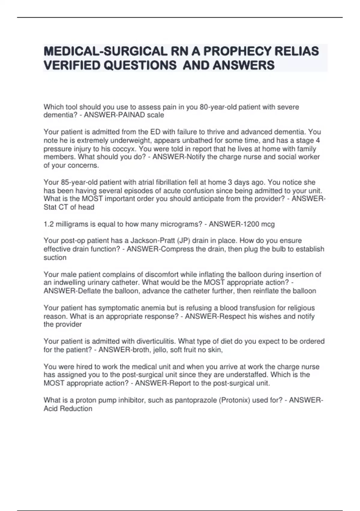 MEDICAL-SURGICAL RN A PROPHECY RELIAS VERIFIED QUESTIONS AND ANSWERS Which tool should you use to assess pain in you 80-year-old patient with severe dementia? - ANSWER-PAINAD scale Your patient is admitted from the ED with failure to thrive and advanced dementia. You note he is extremely underweight, appears unbathed for some time, and has a stage 4 pressure injury to his coccyx. You were told in report that he lives at home with family members. What should you do? - ANSWER-Notify the charge nurse and social worker of your concerns. Your 85-year-old patient with atrial fibrillation fell at home 3 days ago. You notice she has been having several episodes of acute confusion since being admitted to your unit. What is the MOST important order you should anticipate from the provider? - ANSWER Stat CT of head 1.2 milligrams is equal to how many micrograms? - ANSWER-1200 mcg Your post-op patient has a Jackson-Pratt (JP) drain in place. How do you ensure effective drain function? - ANSWER-Compress the drain, then plug the bulb to establish suction Your male patient complains of discomfort while inflating the balloon during insertion of an indwelling urinary catheter. What would be the MOST appropriate action? - ANSWER-Deflate the balloon, advance the catheter further, then reinflate the balloon Your patient has symptomatic anemia but is refusing a blood transfusion for religious reason. What is an appropriate response? - ANSWER-Respect his wishes and notify the provider Your patient is admitted with diverticulitis. What type of diet do you expect to be ordered for the patient? - ANSWER-broth, jello, soft fruit no skin, You were hired to work the medical unit and when you arrive at work the charge nurse has assigned you to the post-surgical unit since they are understaffed. Which is the MOST appropriate action? - ANSWER-Report to the post-surgical unit. What is a proton pump inhibitor, such as pantoprazole (Protonix) used for? - ANSWER Acid Reduction Which adaptive equipment would be MOST appropriate to use for a severely contracted patient who is unable to bear weight when transferring from the bed to the chair? - ANSWER-Patient lift (e.g., Hoyer) Your patient has a temp of 102.3 F, HR 122, and has had 15 mL of urine from the indwelling urinary catheter in the last 2 hours. What is your patient MOST likely experiencing. - ANSWER-Sepsis