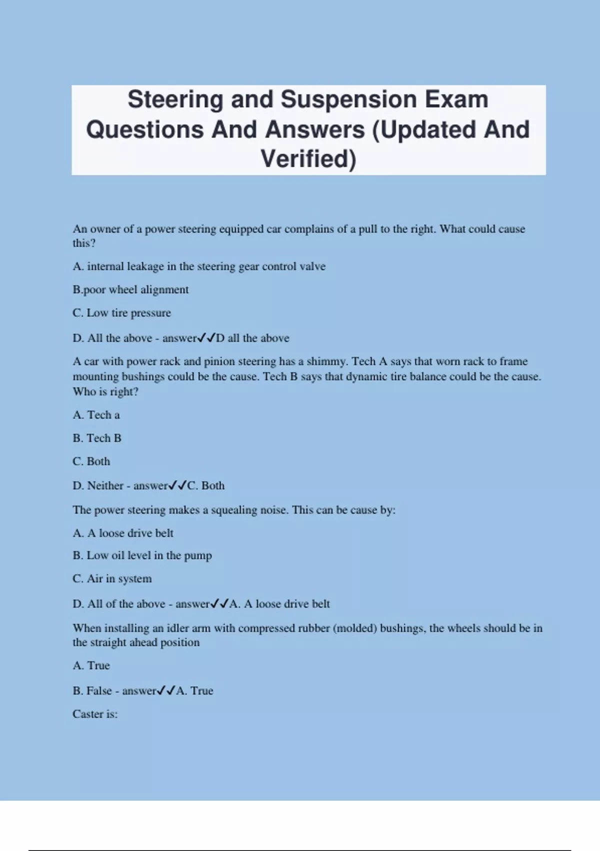 Steering and Suspension Exam Questions And Answers (Updated And Verified) An owner of a power steering equipped car complains of a pull to the right. What could cause this? A. internal leakage in the steering gear control valve B.poor wheel alignment C. Low tire pressure D. All the above - answerD all the above A car with power rack and pinion steering has a shimmy. Tech A says that worn rack to frame mounting bushings could be the cause. Tech B says that dynamic tire balance could be the cause. Who is right? A. Tech a B. Tech B C. Both D. Neither - answerC. Both The power steering makes a squealing noise. This can be cause by: A. A loose drive belt B. Low oil level in the pump C. Air in system D. All of the above - answerA. A loose drive belt When installing an idler arm with compressed rubber (molded) bushings, the wheels should be in the straight ahead position A. True B. False - answerA. True Caster is: A. A toe-in angle B. A tire-wearing angle C. A right angle D a directional control angle - answerD. A directional control angle Caster is measured in A. Degrees B. Fractions of an inch C. Centimeters D decameters - answerA. Degrees Excessive positive camber usually causes? A. Wear on the inside of the tire tread B. Wear at center of tire tread C. Wear on outside of tire tread D no effect on tire wear - answerC wear on outside of tire tread Wheel alignment checks and adjustments cannot be accurate if A. Tires are bald B. Wheel bearings are dry C. Tires have flat spots D. Front suspension is word - answerD. front suspension is worn Toe-out would case which one of the following types of tire wear? A. Cupping around the center of the tire B. Tread feathering inward C. Smooth inside tread D. Tread feathered outward - answerD. Tread feathered outward Poor steering returnability after a turn may be caused by A. Low tire pressure B. Incorrect wheel alignment. Steering gear adjustment to tight