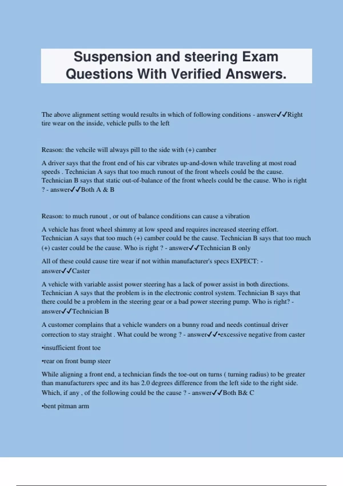 Suspension and steering Exam Questions With Verified Answers. The above alignment setting would results in which of following conditions - answerRight tire wear on the inside, vehicle pulls to the left Reason: the vehcile will always pill to the side with (+) camber A driver says that the front end of his car vibrates up-and-down while traveling at most road speeds . Technician A says that too much runout of the front wheels could be the cause. Technician B says that static out-of-balance of the front wheels could be the cause. Who is right ? - answerBoth A & B Reason: to much runout , or out of balance conditions can cause a vibration A vehicle has front wheel shimmy at low speed and requires increased steering effort. Technician A says that too much (+) camber could be the cause. Technician B says that too much (+) caster could be the cause. Who is right ? - answerTechnician B only All of these could cause tire wear if not within manufacturer's specs EXPECT: - answerCaster A vehicle with variable assist power steering has a lack of power assist in both directions. Technician A says that the problem is in the electronic control system. Technician B says that there could be a problem in the steering gear or a bad power steering pump. Who is right? - answerTechnician B A customer complains that a vehicle wanders on a bunny road and needs continual driver correction to stay straight . What could be wrong ? - answer•excessive negative from caster •insufficient front toe •rear on front bump steer While aligning a front end, a technician finds the toe-out on turns ( turning radius) to be greater than manufacturers spec and its has 2.0 degrees difference from the left side to the right side. Which, if any , of the following could be the cause ? - answerBoth B& C •bent pitman arm •bent tie-rod Reason: toe-out on turns or SAI. If their out of spec means their something bent in front end . In this case , it might be bent pit-man arm or tie rod When checking a tire, a technician finds it to have too much radial (up-and-down) runout. Technician A says to rotate the tire and wheel assembly on the mounting studs to correct the problem. Technician B says to rotate the tire on the wheel assembly to attempt to bring the runout within specifications. Who is right? - answerTechnician B only Reason: to fix tire runout. It's possible to rotate the tire on the rim to compensate for high & low spots If you readjust camber on the left front strut, which, if any, of of these specification might change? - answerLeft toe and total toe Reason : when your readjust camber or caster it affects toe Too much caster on the left wheel will cause the ? - answerVehicle to drift to the right Reason: vehicle will steer or drift to the side with the least amount of camber The suspension shown above is being checked for ball joint wear. Technician A says that the inspection can be made with the front end supported a point X. Technician B says that the inspection can be performed with the front end supported at point Y. Who is right? - answerTechnician B only Reason: when the spring goes to the lower control arm you have to unload the spring to check the bolt joints for wear. A pressure test is being performed on a car with power steering. The pressure readings taken when the wheels are at the right and left stops are below specs. The tester readings readings are normal when the tester shutoff valve is closed. The tester reading are normal when the tester shutoff valve is closed . Technician A says that these readings could be caused by bad steering gear. Technician B says that a bad pump could cause these readings. Who is right ? - answerTechnician A only