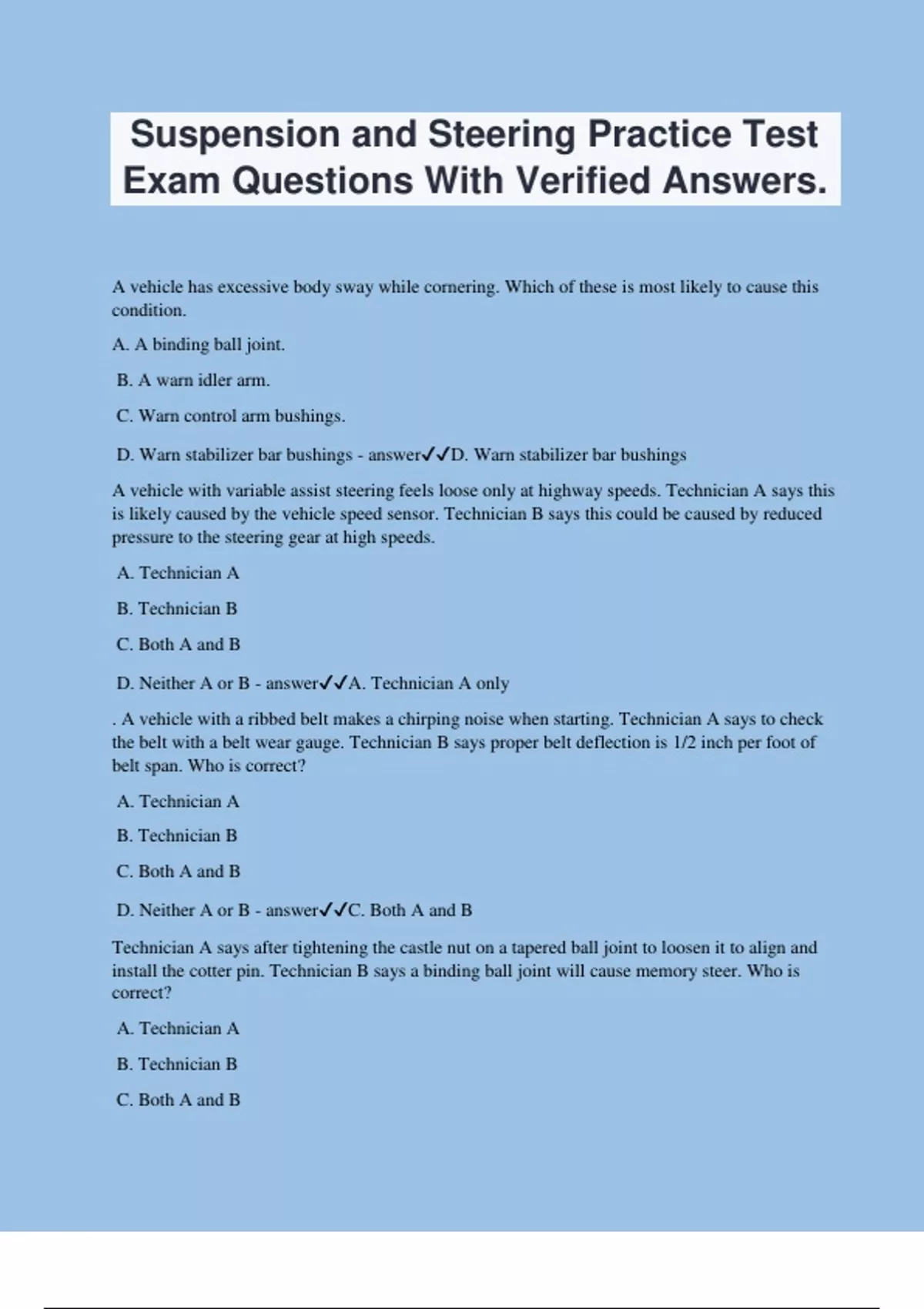 Suspension and Steering Practice Test Exam Questions With Verified Answers. A vehicle has excessive body sway while cornering. Which of these is most likely to cause this condition. A. A binding ball joint. B. A warn idler arm. C. Warn control arm bushings. D. Warn stabilizer bar bushings - answerD. Warn stabilizer bar bushings A vehicle with variable assist steering feels loose only at highway speeds. Technician A says this is likely caused by the vehicle speed sensor. Technician B says this could be caused by reduced pressure to the steering gear at high speeds. A. Technician A B. Technician B C. Both A and B D. Neither A or B - answerA. Technician A only . A vehicle with a ribbed belt makes a chirping noise when starting. Technician A says to check the belt with a belt wear gauge. Technician B says proper belt deflection is 1/2 inch per foot of belt span. Who is correct? A. Technician A B. Technician B C. Both A and B D. Neither A or B - answerC. Both A and B Technician A says after tightening the castle nut on a tapered ball joint to loosen it to align and install the cotter pin. Technician B says a binding ball joint will cause memory steer. Who is correct? A. Technician A B. Technician B C. Both A and B D. Neither A or B - answerB. Technician B only On cold mornings the warning lamp on a vehicle with a tire pressure monitoring system TPMS stays illuminated for several minutes before it goes out. Which of these are most likely the cause of this condition. A. Clogged TPMS sensor. B. Worn tread on one of the tires. C. TPMS initialization. D. Low tire pressure - answerD. Low tire pressure A front wheel drive vehicle has a pull and is being checked for alignment angles. Technician A says loose engine cradle bolts have no affect on a vehicle's steering system. Technician B says if the engine cradle is not centered before tightening the bolts the wheel alignment angles will be affected. Who is correct? A. Technician A B. Technician B C. Both A and B D. Neither A or B - answerB. Technician B only Two technicians are discussing an electronic air suspension system. Technician A says the suspension switch must be turned off before lifting the vehicle. Technician B says soapy water is used to check these systems for leaks. Who is correct? A. Technician A B. Technician B C. Both A and B D. Neither A or B - answerC. Both A and B Loose tie rods are discovered during the initial inspection of a vehicles steering linkage. Technician A says loose tie rods will cause a clunking or popping noise while turning. Technician B says loose tie rods will result in constant steering correction and vehicle wander. Who is correct? A. Technician A B. Technician B C. Both A and B D. Neither A or B - answerC. Both A and B
