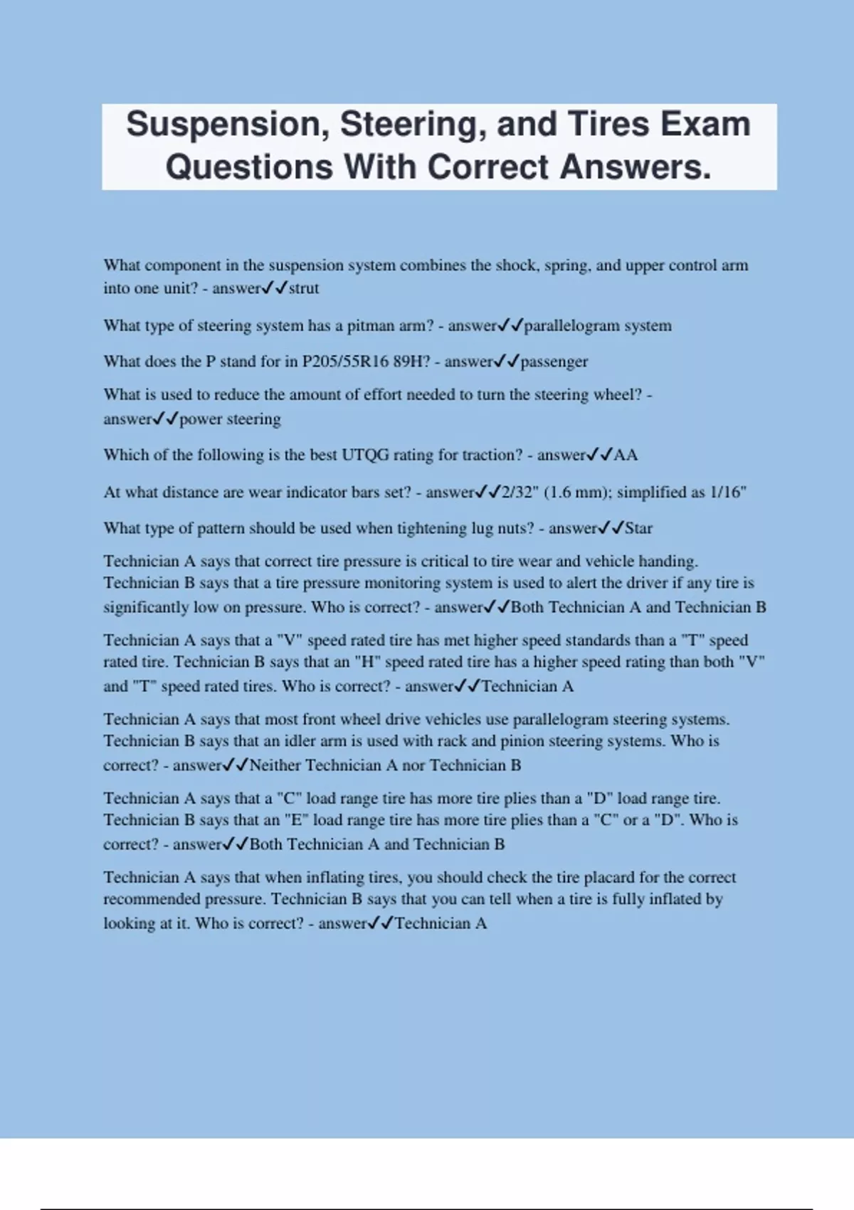 Suspension, Steering, and Tires Exam Questions With Correct Answers