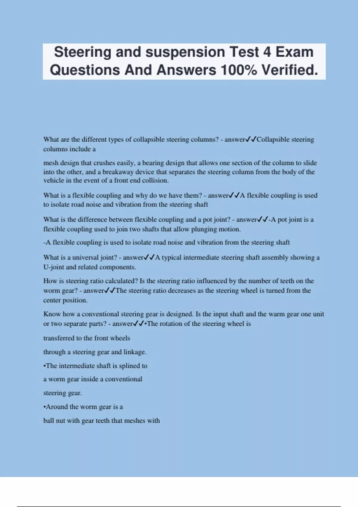 Steering and suspension Test 4 Exam Questions And Answers 100% Verified. What are the different types of collapsible steering columns? - answerCollapsible steering columns include a mesh design that crushes easily, a bearing design that allows one section of the column to slide into the other, and a breakaway device that separates the steering column from the body of the vehicle in the event of a front end collision. What is a flexible coupling and why do we have them? - answerA flexible coupling is used to isolate road noise and vibration from the steering shaft What is the difference between flexible coupling and a pot joint? - answer-A pot joint is a flexible coupling used to join two shafts that allow plunging motion. -A flexible coupling is used to isolate road noise and vibration from the steering shaft What is a universal joint? - answerA typical intermediate steering shaft assembly showing a U-joint and related components. How is steering ratio calculated? Is the steering ratio influenced by the number of teeth on the worm gear? - answerThe steering ratio decreases as the steering wheel is turned from the center position. Know how a conventional steering gear is designed. Is the input shaft and the warm gear one unit or two separate parts? - answer•The rotation of the steering wheel is transferred to the front wheels through a steering gear and linkage. •The intermediate shaft is splined to a worm gear inside a conventional steering gear. •Around the worm gear is a ball nut with gear teeth that meshes with
