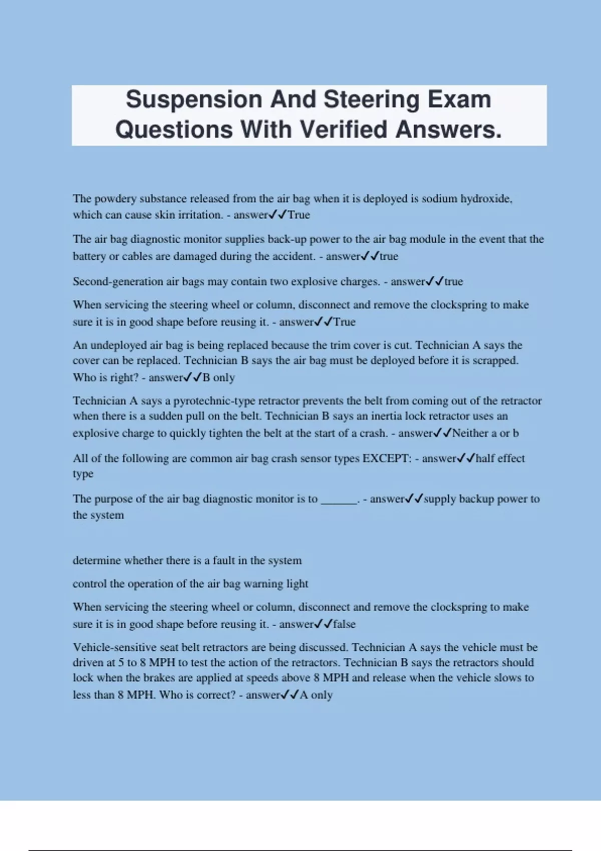 Suspension And Steering Exam Questions With Verified Answers. The powdery substance released from the air bag when it is deployed is sodium hydroxide, which can cause skin irritation. - answerTrue The air bag diagnostic monitor supplies back-up power to the air bag module in the event that the battery or cables are damaged during the accident. - answertrue Second-generation air bags may contain two explosive charges. - answertrue When servicing the steering wheel or column, disconnect and remove the clockspring to make sure it is in good shape before reusing it. - answerTrue An undeployed air bag is being replaced because the trim cover is cut. Technician A says the cover can be replaced. Technician B says the air bag must be deployed before it is scrapped. Who is right? - answerB only Technician A says a pyrotechnic-type retractor prevents the belt from coming out of the retractor when there is a sudden pull on the belt. Technician B says an inertia lock retractor uses an explosive charge to quickly tighten the belt at the start of a crash. - answerNeither a or b All of the following are common air bag crash sensor types EXCEPT: - answerhalf effect type The purpose of the air bag diagnostic monitor is to ______. - answersupply backup power to the system determine whether there is a fault in the system control the operation of the air bag warning light When servicing the steering wheel or column, disconnect and remove the clockspring to make sure it is in good shape before reusing it. - answerfalse Vehicle-sensitive seat belt retractors are being discussed. Technician A says the vehicle must be driven at 5 to 8 MPH to test the action of the retractors. Technician B says the retractors should lock when the brakes are applied at speeds above 8 MPH and release when the vehicle slows to less than 8 MPH. Who is correct? - answerA only Second-generation air bag systems are being discussed. Technician A says a second-generation air bag inflates with about 20 to 35 percent more energy than first-generation ones. Technician B says second-generation air bags reduce the number of injuries caused by the air bag itself. Who is correct? - answerb only The wiring harness and electrical connectors for the air bag system components are ______. - answeryellow A pretensioner may use an explosive charge to retract the seat belt. - answertrue Technician A says when the SIR warning light is illuminated all the time, there is a fault code stored in the SIR control module. Technician B says if the warning light is on, the air bag system is turned off and the air bag will not deploy in an accident. Who is correct? - answerBoth A and B The side impact air bags deploy at the same time as the front air bags. - answerfalse Technician A says that air bag systems may use up to five sensors. Technician B says all sensors are located in the passenger compartment. Who is correct? - answerA only A live air bag must be deployed before disposal. - answerTrue If a seat belt will not buckle, ______. - answeruse a flashlight to check the buckle for foreign objects To prevent accidental deployment, most air bag systems require that at least _____ sensor switches are closed before an air bag can be deployed. - answer2 Which of the following is NOT a kind of safing sensor? - answerpiezoresistive type Technician A says that an air bag module is serviced as an assembly. Technician B says that it is acceptable to replace all the sensors if one is damaged. Who is correct? - answerboth A and B When placing a live air bag module on a table or bench, make sure the trim and air bag face up. - answerTrue Technician A says that the air bag control module contains the clockspring and the inflator. Technician B says that the air bag sensing diagnostic monitor assembly (ASDM) supplies emergency current to the system if battery voltage is lost. Who is correct? - answerB only Side head protection air bags stay inflated for about five seconds to offer protection against a second or third impact. - answerTrue Rack and pinion steering systems are being discussed. Technician A says they do not require inner tie-rod ends. Technician B says they require two outer tie-rod ends. Who is correct? - answerb only