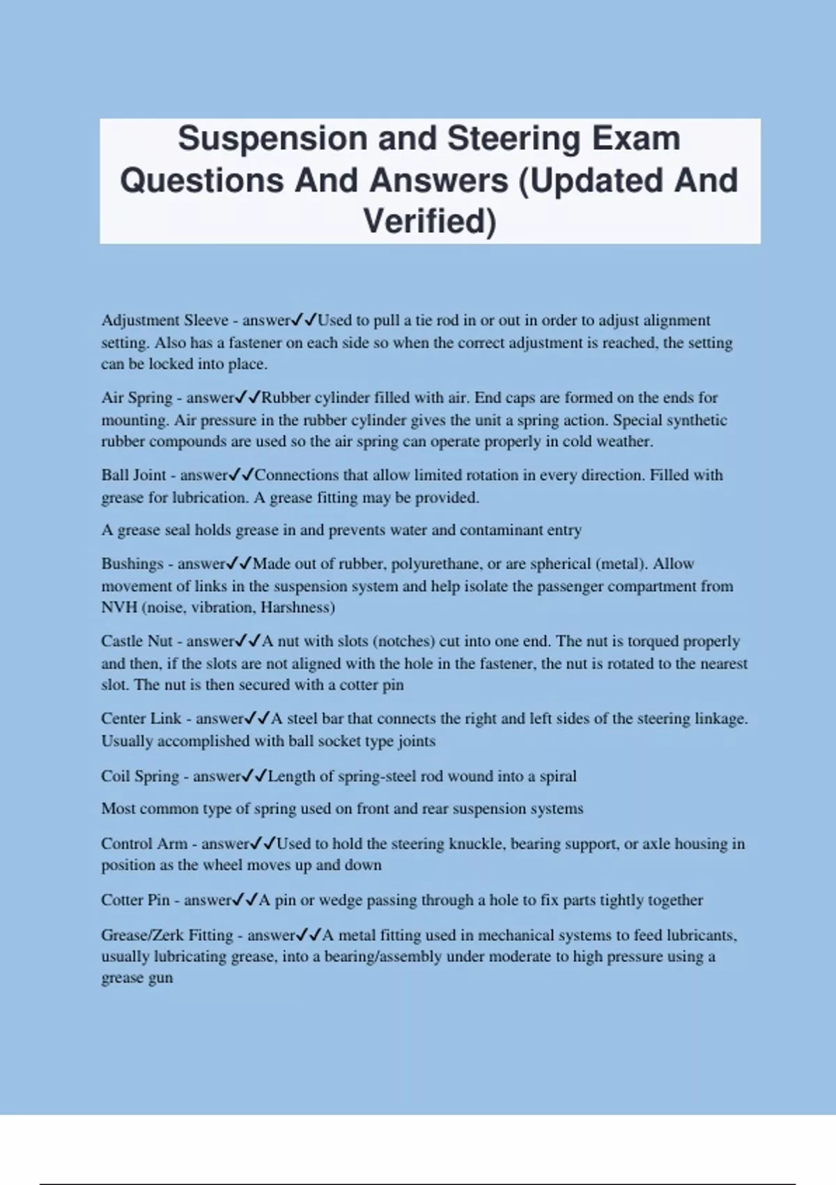 Suspension and Steering Exam Questions And Answers (Updated And Verified) Adjustment Sleeve - answerUsed to pull a tie rod in or out in order to adjust alignment setting. Also has a fastener on each side so when the correct adjustment is reached, the setting can be locked into place. Air Spring - answerRubber cylinder filled with air. End caps are formed on the ends for mounting. Air pressure in the rubber cylinder gives the unit a spring action. Special synthetic rubber compounds are used so the air spring can operate properly in cold weather. Ball Joint - answerConnections that allow limited rotation in every direction. Filled with grease for lubrication. A grease fitting may be provided. A grease seal holds grease in and prevents water and contaminant entry Bushings - answerMade out of rubber, polyurethane, or are spherical (metal). Allow movement of links in the suspension system and help isolate the passenger compartment from NVH (noise, vibration, Harshness) Castle Nut - answerA nut with slots (notches) cut into one end. The nut is torqued properly and then, if the slots are not aligned with the hole in the fastener, the nut is rotated to the nearest slot. The nut is then secured with a cotter pin Center Link - answerA steel bar that connects the right and left sides of the steering linkage. Usually accomplished with ball socket type joints Coil Spring - answerLength of spring-steel rod wound into a spiral Most common type of spring used on front and rear suspension systems Control Arm - answerUsed to hold the steering knuckle, bearing support, or axle housing in position as the wheel moves up and down Cotter Pin - answerA pin or wedge passing through a hole to fix parts tightly together Grease/Zerk Fitting - answerA metal fitting used in mechanical systems to feed lubricants, usually lubricating grease, into a bearing/assembl