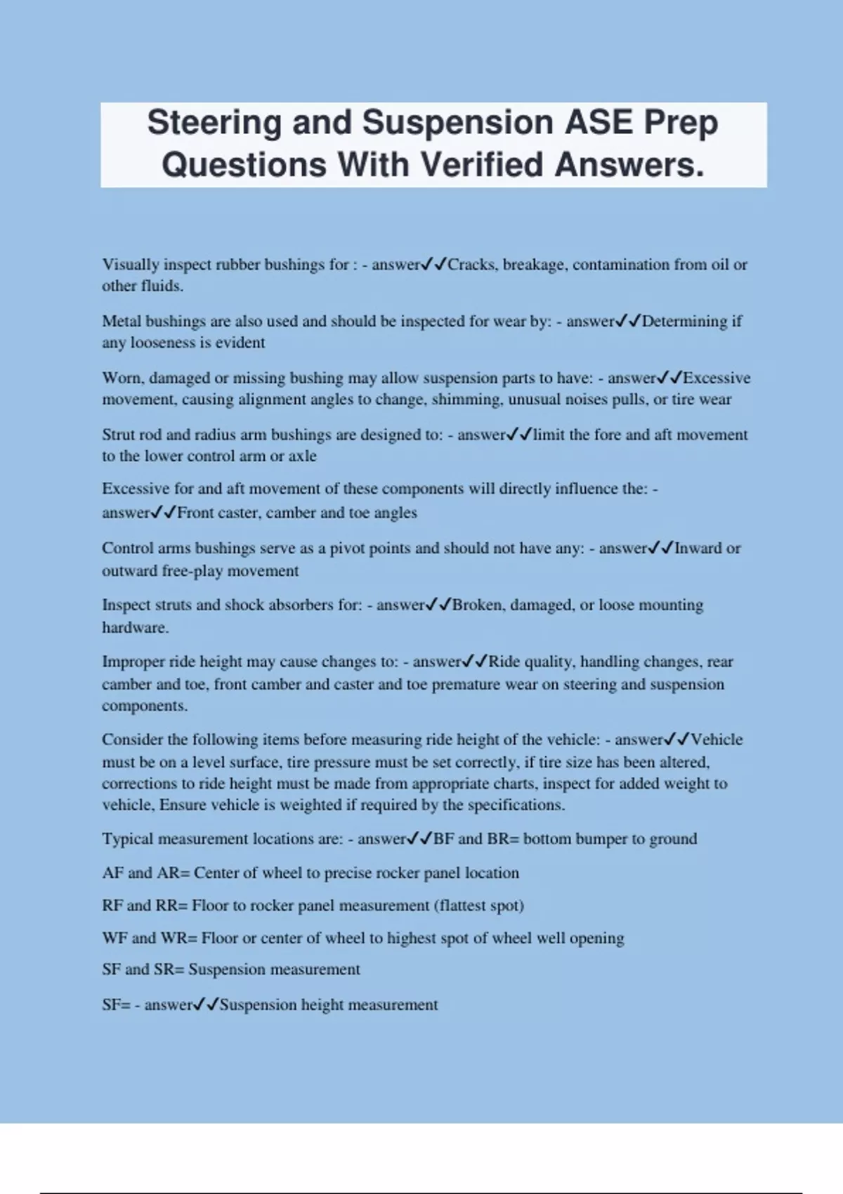 Steering and Suspension ASE Prep Questions With Verified Answers. Visually inspect rubber bushings for : - answerCracks, breakage, contamination from oil or other fluids. Metal bushings are also used and should be inspected for wear by: - answerDetermining if any looseness is evident Worn, damaged or missing bushing may allow suspension parts to have: - answerExcessive movement, causing alignment angles to change, shimming, unusual noises pulls, or tire wear Strut rod and radius arm bushings are designed to: - answerlimit the fore and aft movement to the lower control arm or axle Excessive for and aft movement of these components will directly influence the: - answerFront caster, camber and toe angles Control arms bushings serve as a pivot points and should not have any: - answerInward or outward free-play movement Inspect struts and shock absorbers for: - answerBroken, damaged, or loose mounting hardware. Improper ride height may cause changes to: - answerRide quality, handling changes, rear camber and toe, front camber and caster and toe premature wear on steering and suspension components. Consider the following items before measuring ride height of the vehicle: - answerVehicle must be on a level surface, tire pressure must be set correctly, if tire size has been altered, corrections to ride height must be made from appropriate charts, inspect for added weight to vehicle, Ensure vehicle is weighted if required by the specifications. Typical measurement locations are: - answerBF and BR= bottom bumper to ground AF and AR= Center of wheel to precise rocker panel location RF and RR= Floor to rocker panel measurement (flattest spot) WF and WR= Floor or center of wheel to highest spot of wheel well opening SF and SR= Suspension measurement SF= - answerSuspension height measurement