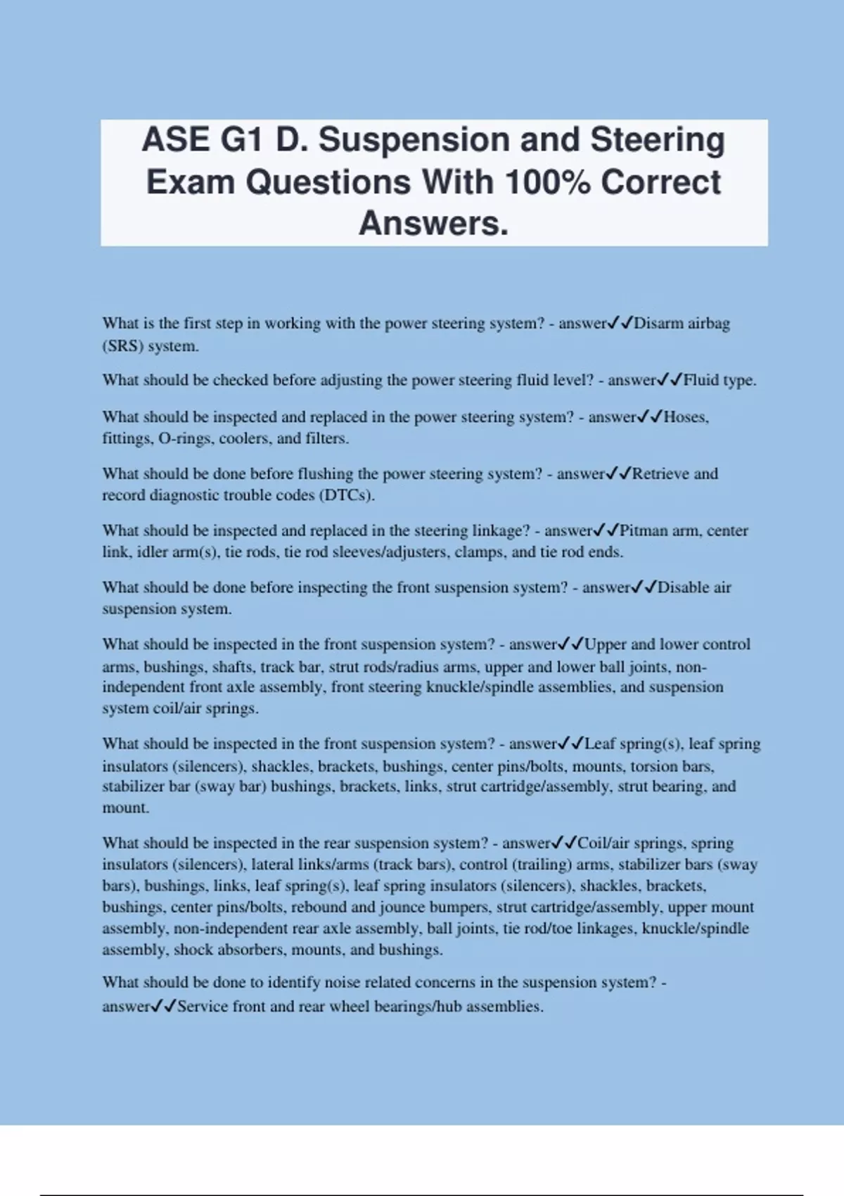 ASE G1 D. Suspension and Steering Exam Questions With 100% Correct Answers. What is the first step in working with the power steering system? - answerDisarm airbag (SRS) system. What should be checked before adjusting the power steering fluid level? - answerFluid type. What should be inspected and replaced in the power steering system? - answerHoses, fittings, O-rings, coolers, and filters. What should be done before flushing the power steering system? - answerRetrieve and record diagnostic trouble codes (DTCs). What should be inspected and replaced in the steering linkage? - answerPitman arm, center link, idler arm(s), tie rods, tie rod sleeves/adjusters, clamps, and tie rod ends. What should be done before inspecting the front suspension system? - answerDisable air suspension system. What should be inspected in the front suspension system? - answerUpper and lower control arms, bushings, shafts, track bar, strut ro