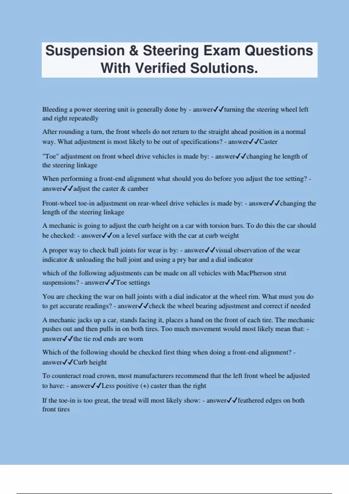 Suspension & Steering Exam Questions With Verified Solutions. Bleeding a power steering unit is generally done by - answerturning the steering wheel left and right repeatedly After rounding a turn, the front wheels do not return to the straight ahead position in a normal way. What adjustment is most likely to be out of specifications? - answerCaster "Toe" adjustment on front wheel drive vehicles is made by: - answerchanging he length of the steering linkage When performing a front-end alignment what should you do before you adjust the toe setting? - answeradjust the caster & camber Front-wheel toe-in adjustment on rear-wheel drive vehicles is made by: - answerchanging the length of the steering linkage A mechanic is going to adjust the curb height on a car with torsion bars. To do this the car should be checked: - answeron a level surface with the car at curb weight A proper way to check ball joints for wear is by: - answervisual observation of the wear indicator & unloading the ball joint and using a pry bar and a dial indicator which of the following adjustments can be made on all vehicles with MacPherson strut suspensions? - answerToe settings You are checking the war on ball joints with a dial indicator at the wheel rim. What must you do to get accurate readings? - answercheck the wheel bearing adjustment and correct if needed A mechanic jacks up a car, stands facing it, places a hand on the front of each tire. The mechanic pushes out and then pulls in on both tires. Too much movement would most likely mean that: - answerthe tie rod ends are worn Which of the following should be checked first thing when doing a front-end alignment? - answerCurb height To counteract road crown, most manufacturers recommend that the left front wheel be adjusted to have: - answerLess positive (+) caster than the right If the toe-in is too great, the tread will most likely show: - answerfeathered edges on both front tires