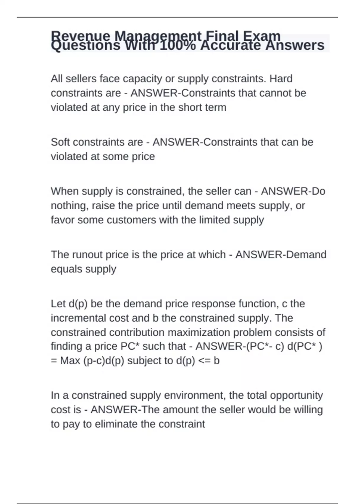 All sellers face capacity or supply constraints. Hard constraints are - ANSWER-Constraints that cannot be violated at any price in the short term Soft constraints are - ANSWER-Constraints that can be violated at some price When supply is constrained, the seller can - ANSWER-Do nothing, raise the price until demand meets supply, or favor some customers with the limited supply The runout price is the price at which - ANSWER-Demand equals supply Let d(p) be the demand price response function, c the incremental cost and b the constrained supply. The constrained contribution maximization problem consists of finding a price PC* such that - ANSWER-(PC*- c) d(PC* ) = Max (p-c)d(p) subject to d(p) <= b In a constrained supply environment, the total opportunity cost is - ANSWER-The amount the seller would be willing to pay to eliminate the constraint